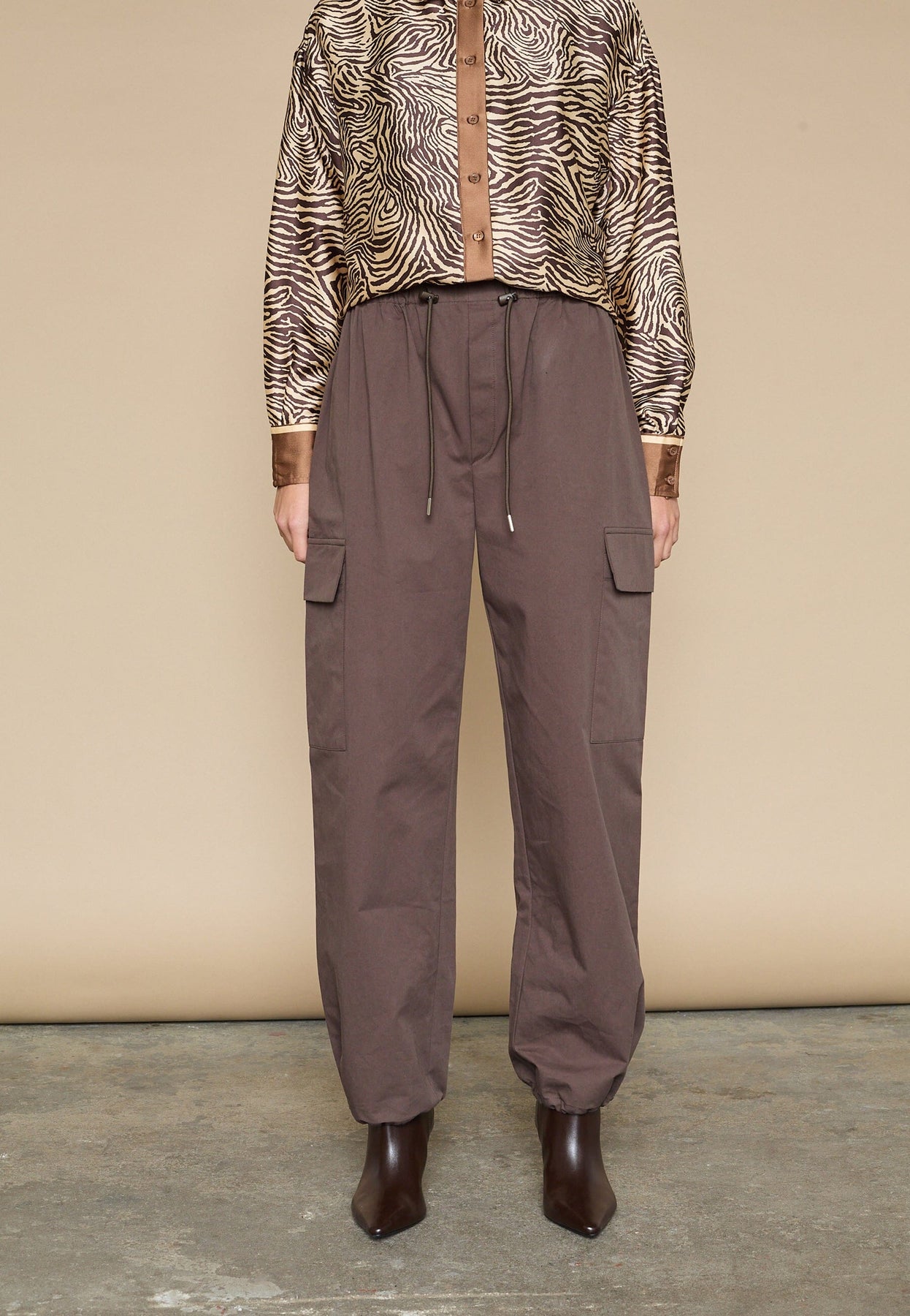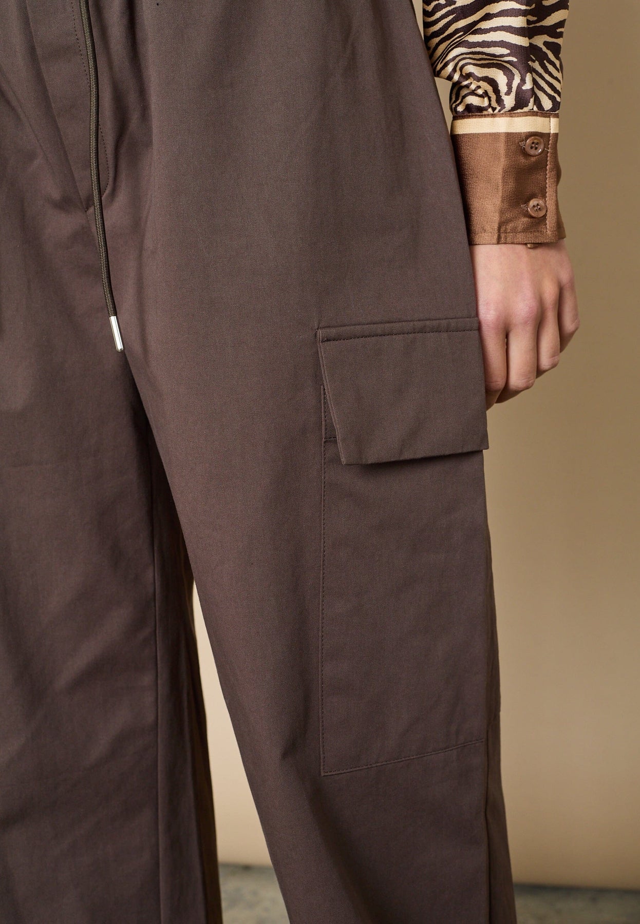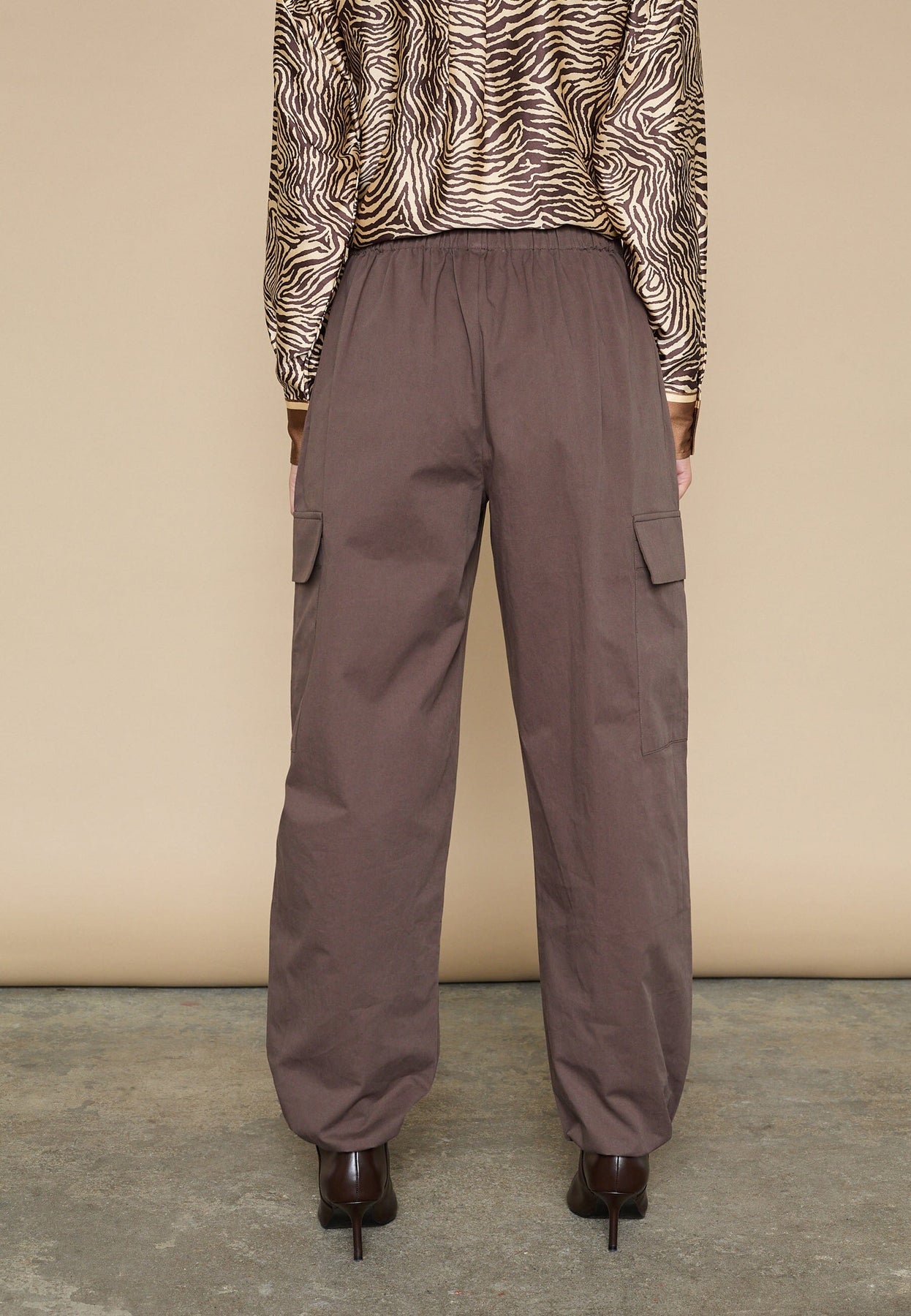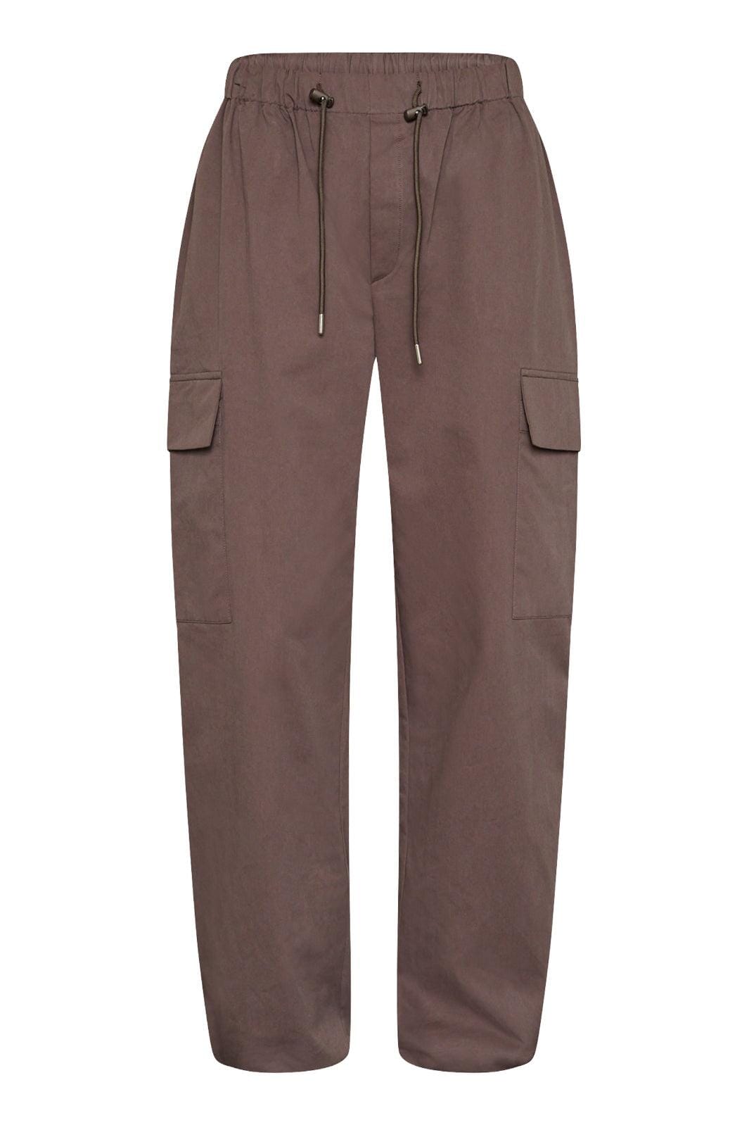 Brune bukser fra Love & Divine, laget av 100 % bomull. Buksene har høy midje, en løs passform og rekker ned til anklene.