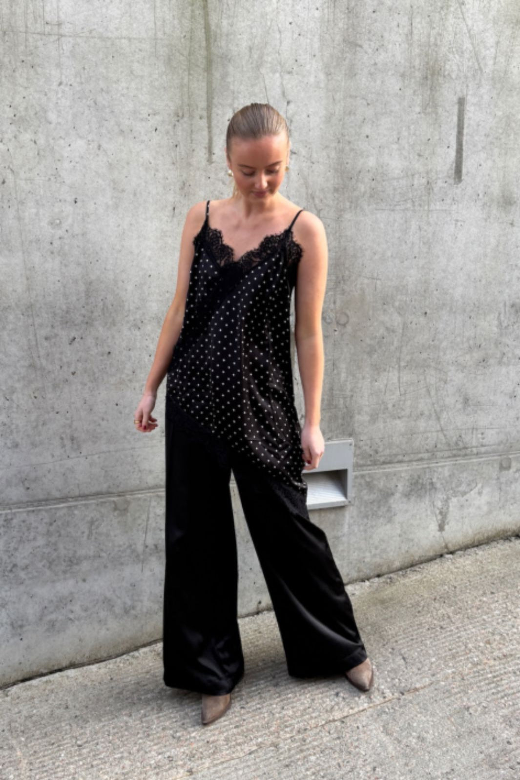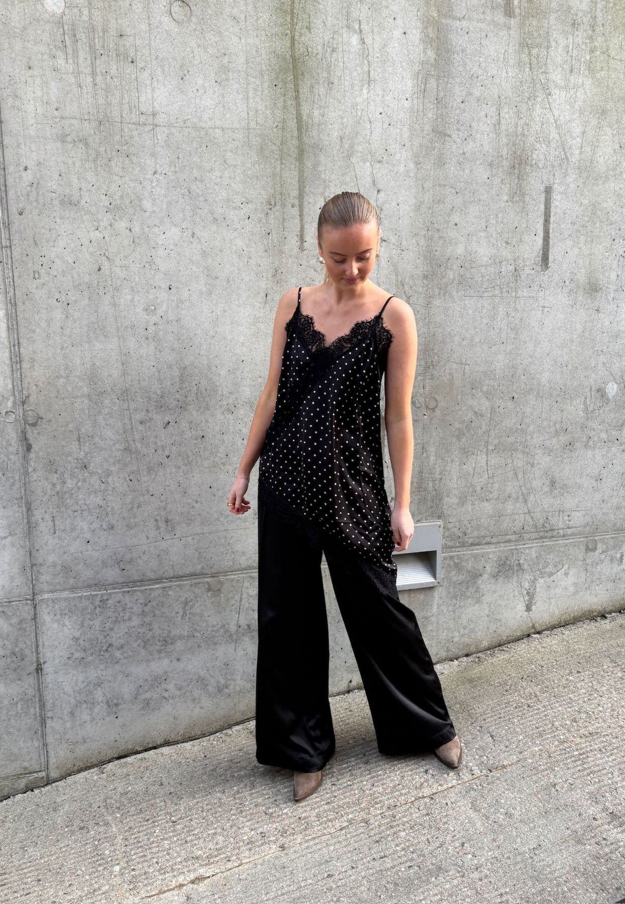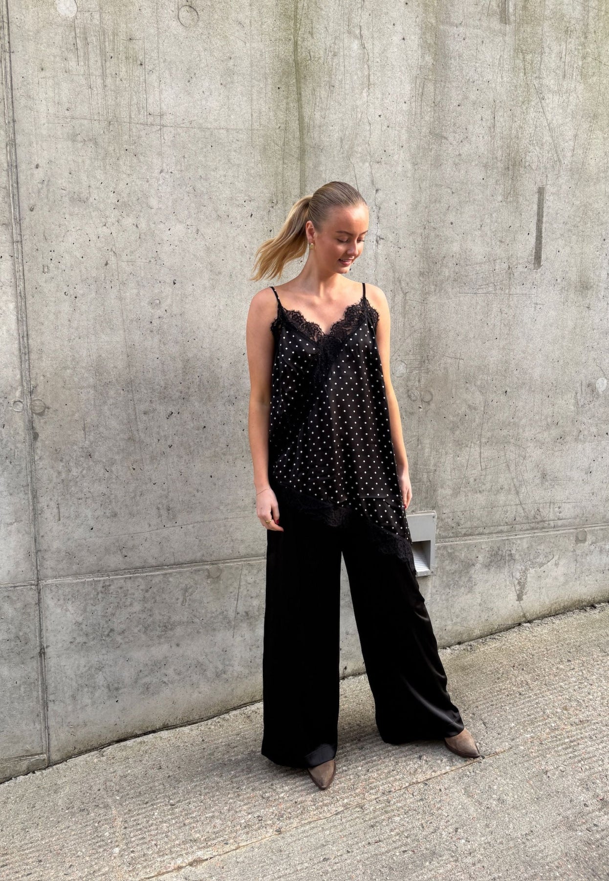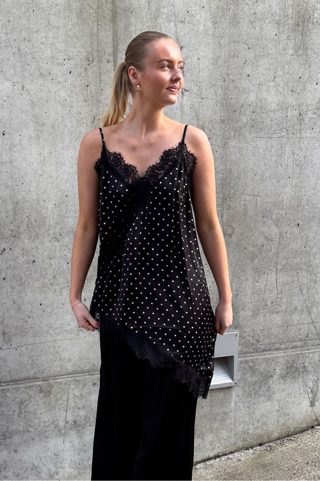 Sort topp fra Love & Divine med hvite prikker. Toppen har tynne spagettistropper og en asymmetrisk blondekant nederst.