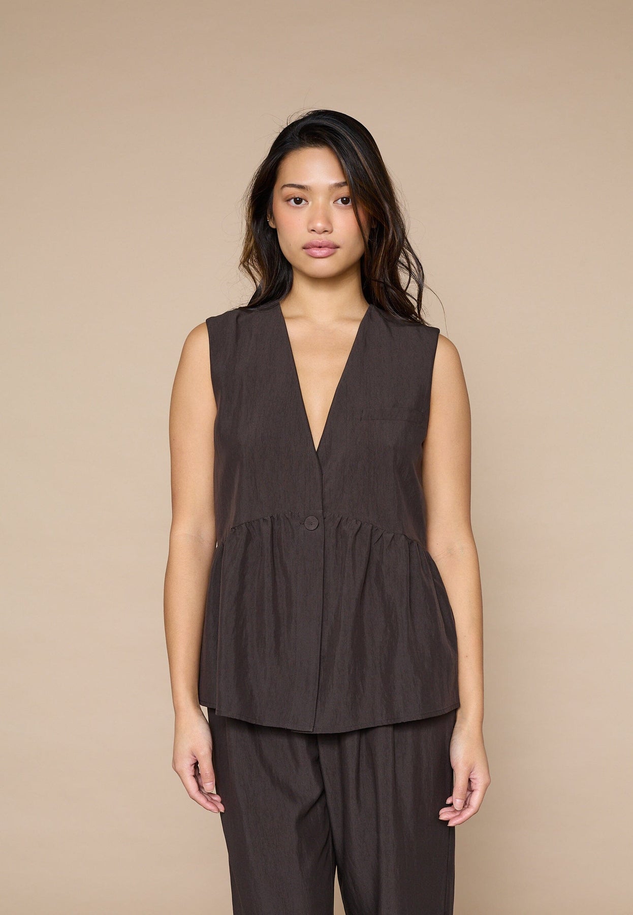 Ermeløs topp fra Love & Divine i en mørk sjokoladebrun farge. Toppen har en dyp V-utringning og er dekorert med broderi og volanger.