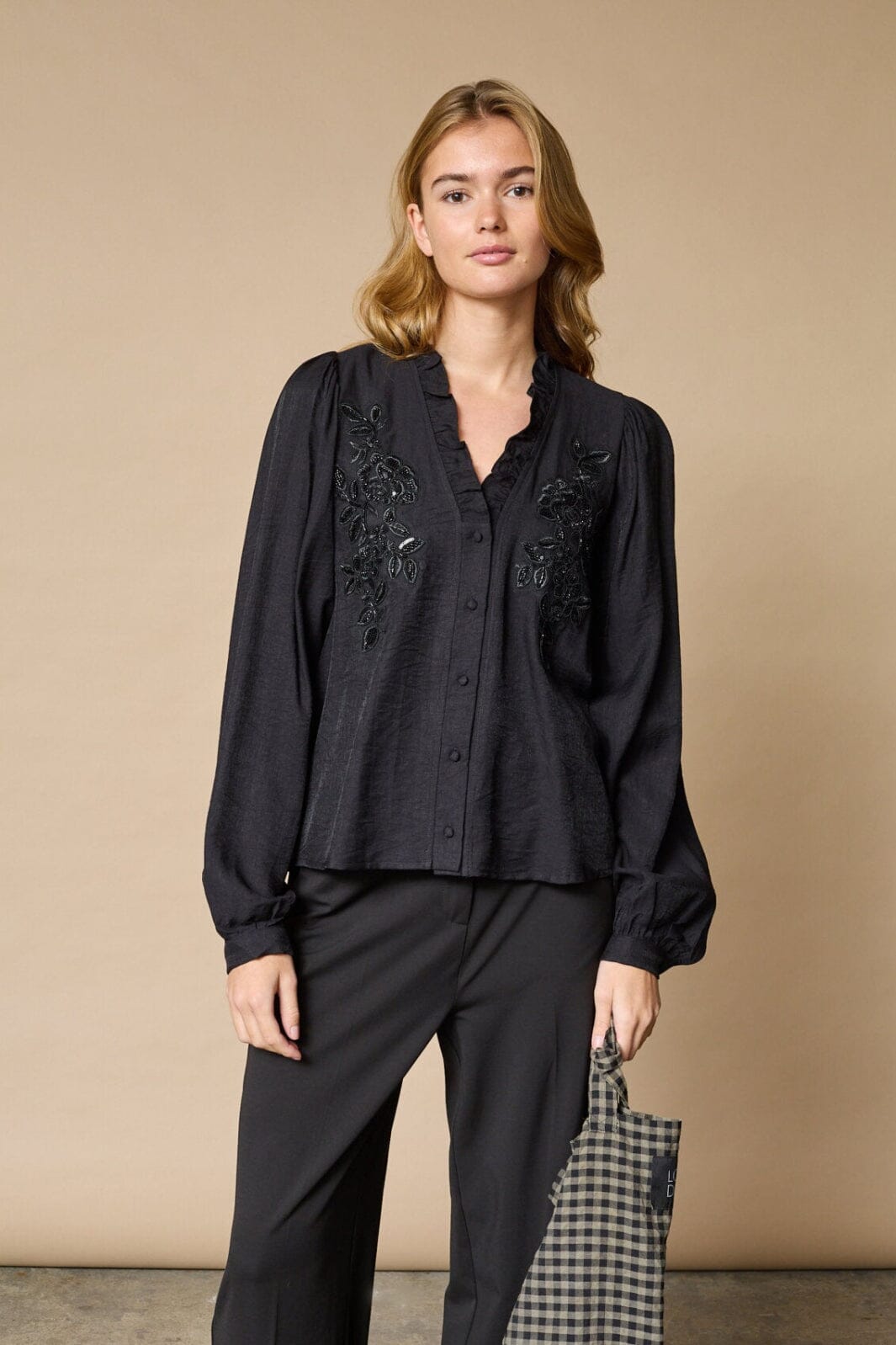 Sort skjorte fra Love & Divine med blomsterbroderi, paljetter og volanger på forsiden. Den har en rynket krage ved V-halsen og lange ermer med mansjetter.