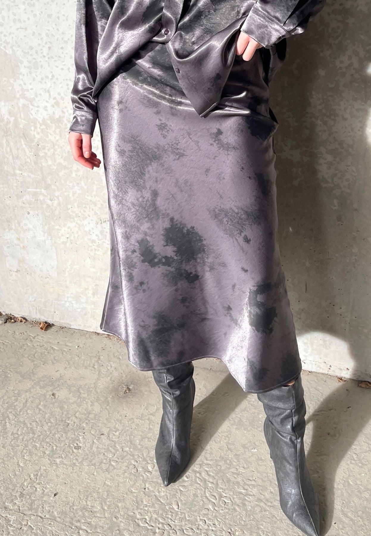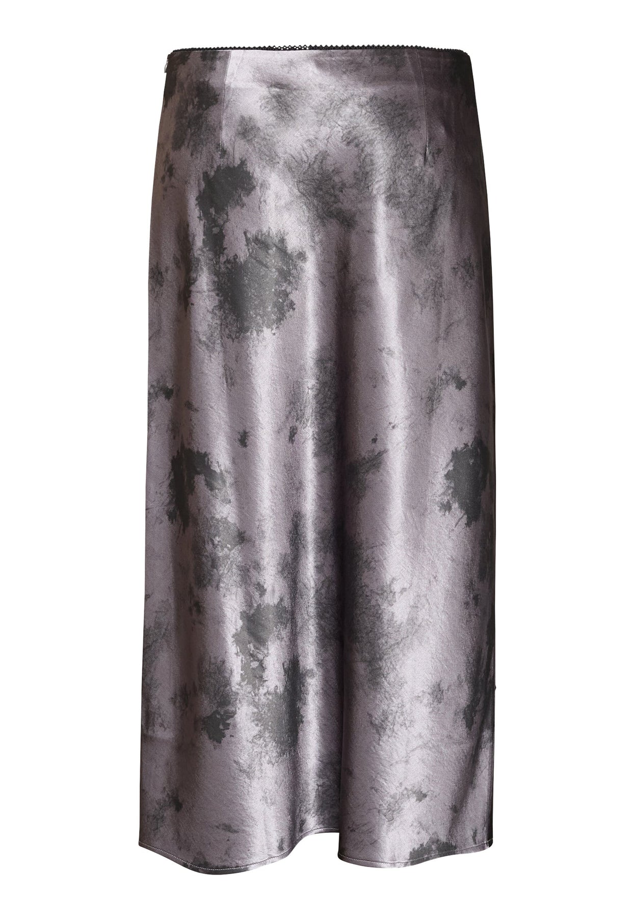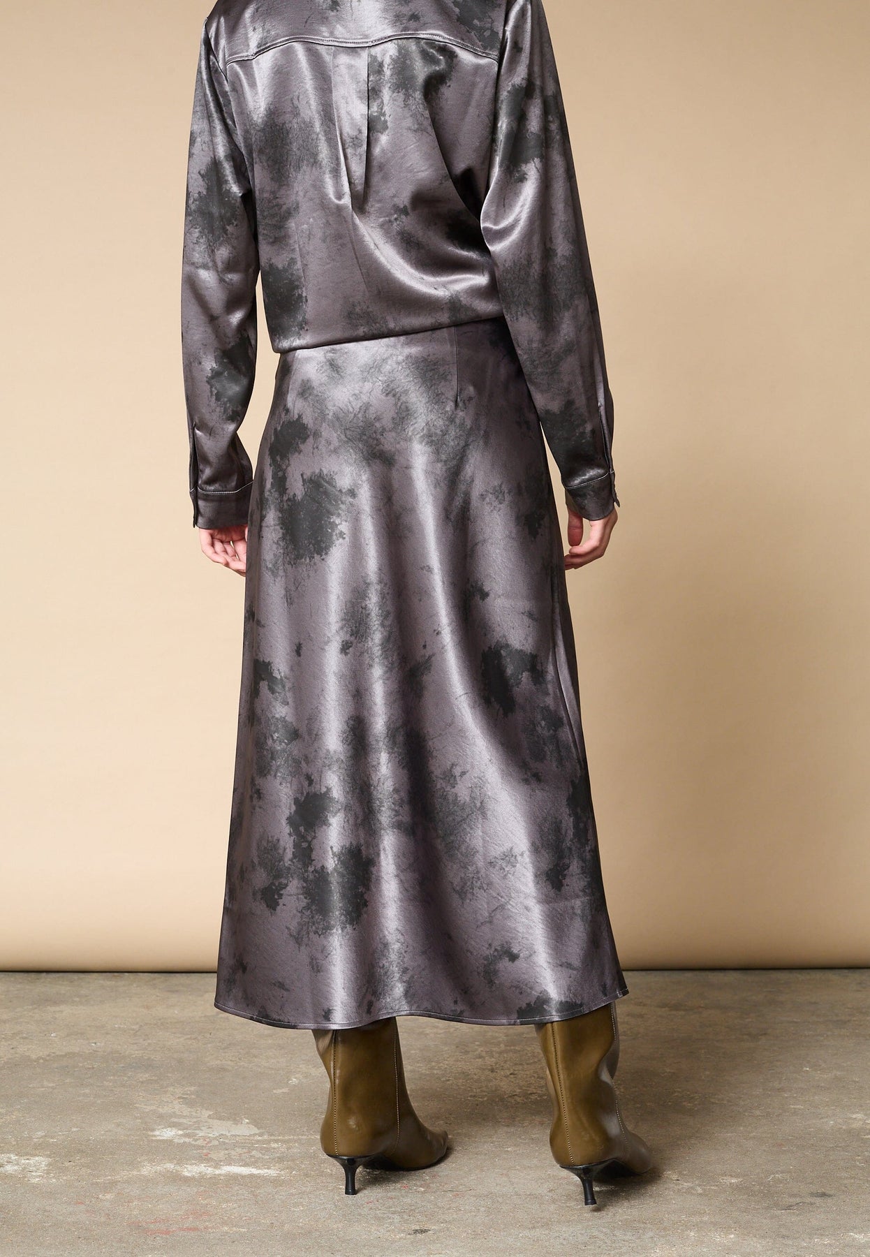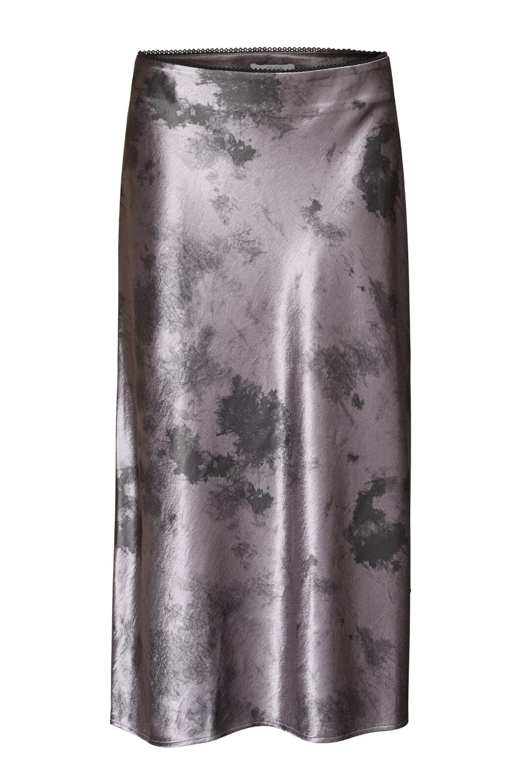 Skjørt fra Love & Divine i grå og sølvnyanser med et marmorert acid wash-mønster i skinnende polyester.