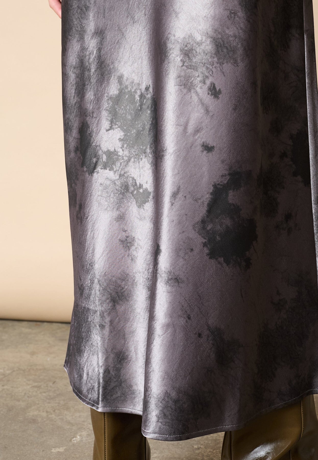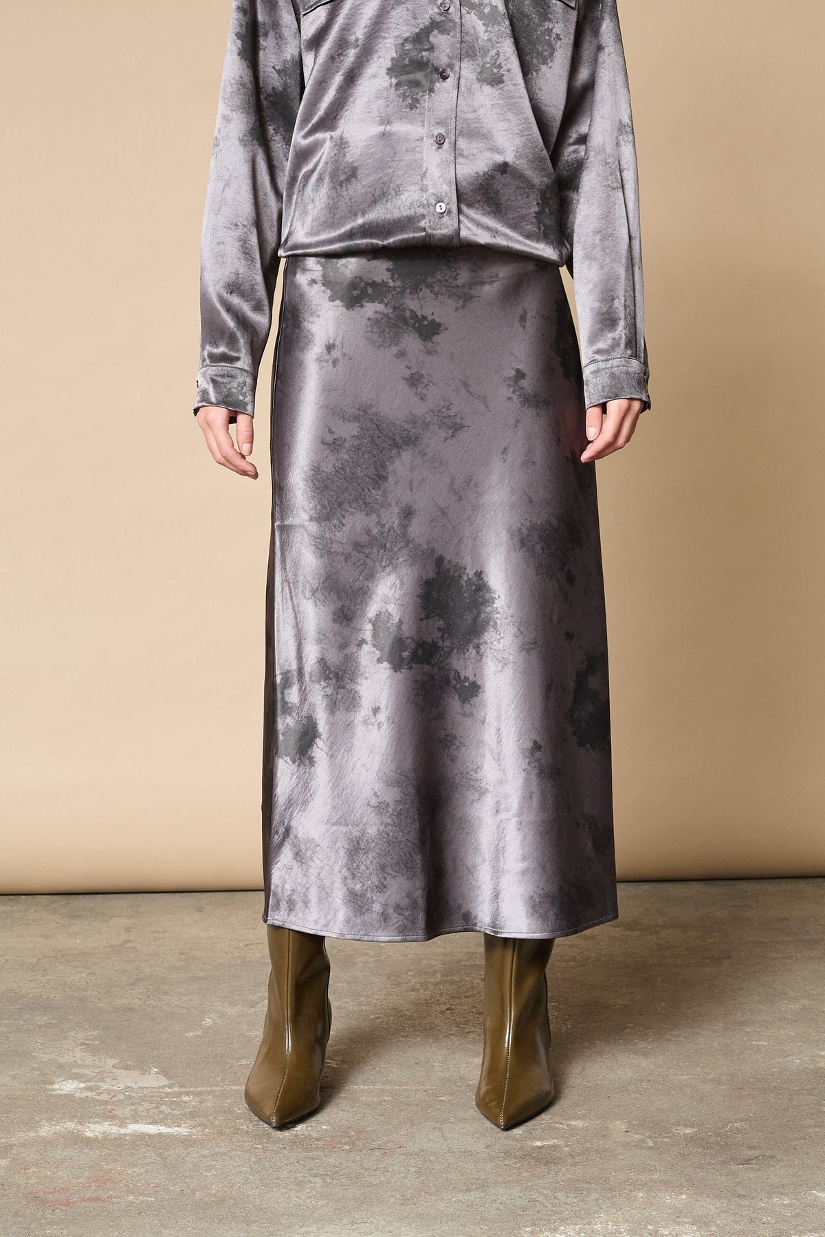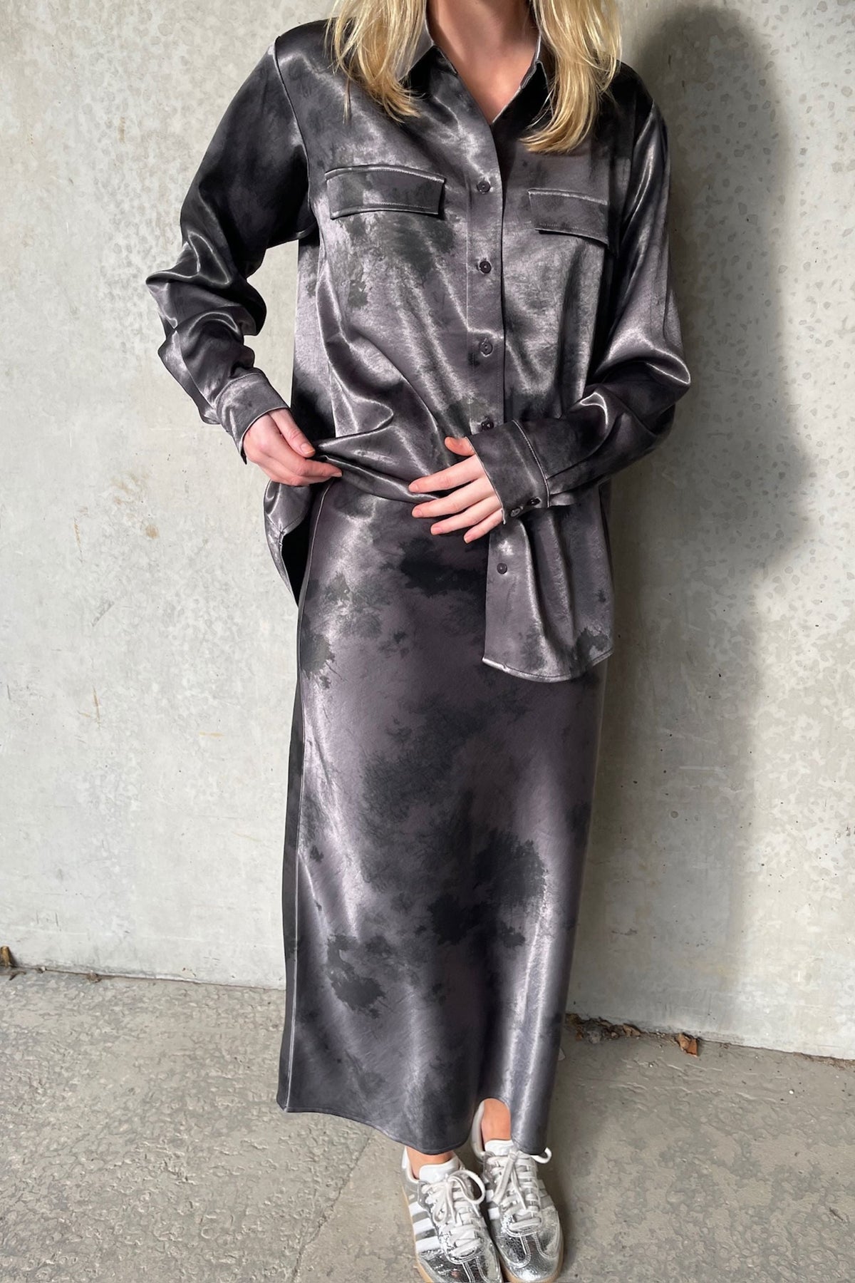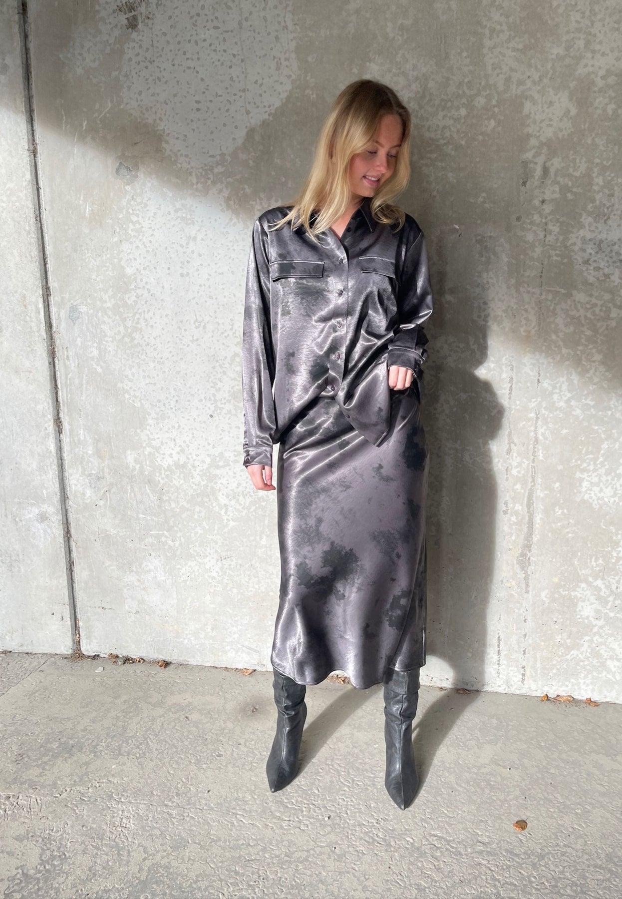 Skjørt fra Love & Divine i grå og sølvnyanser med et marmorert acid wash-mønster i skinnende polyester.