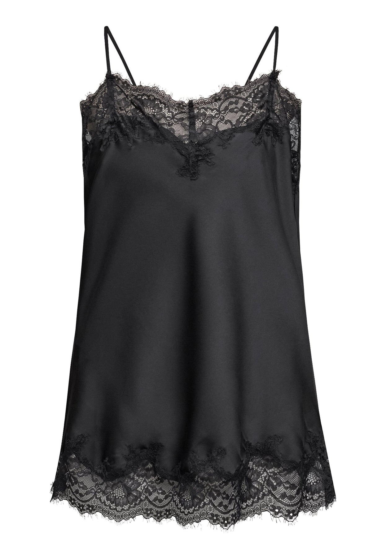 Sort topp fra Love & Divine med tynne spagettistropper og blondekanter. Toppen har v-hals og en løs passform.