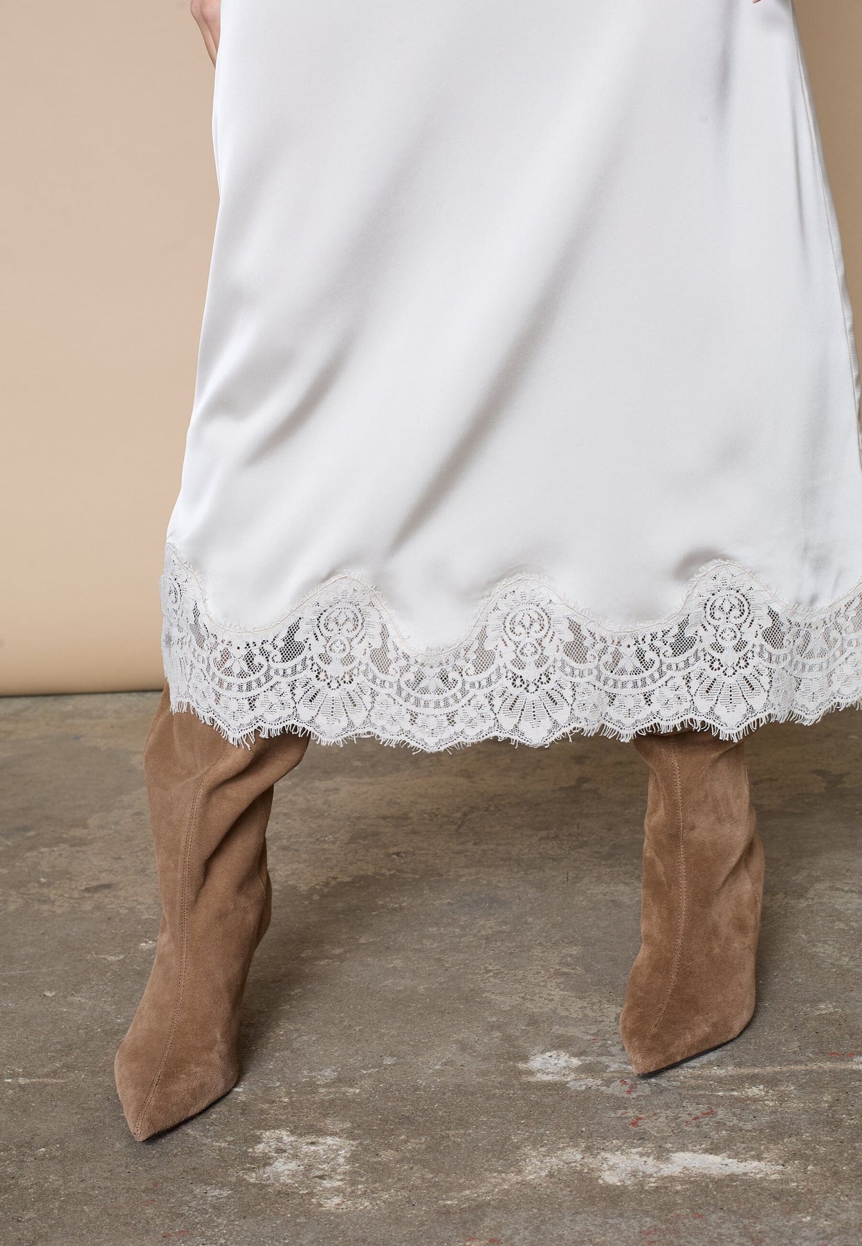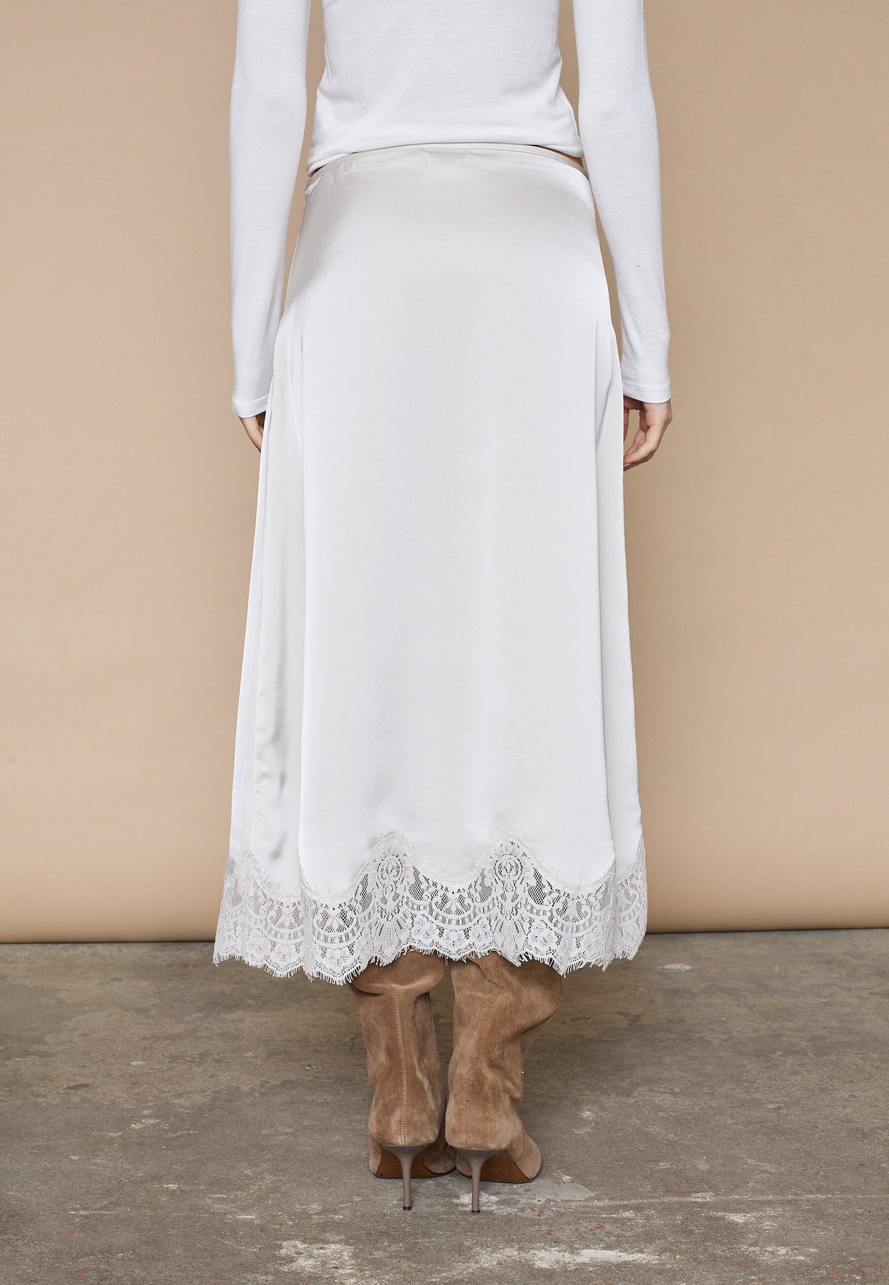 Et langt skjørt fra Love & Divine i hvit og kremfarget nyanse. Skjørtet har en glatt og skinnende overflate med blondekant langs kanten.