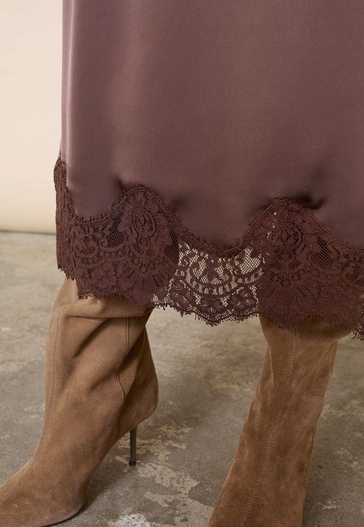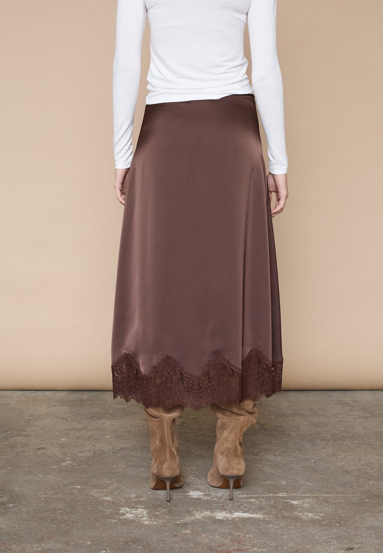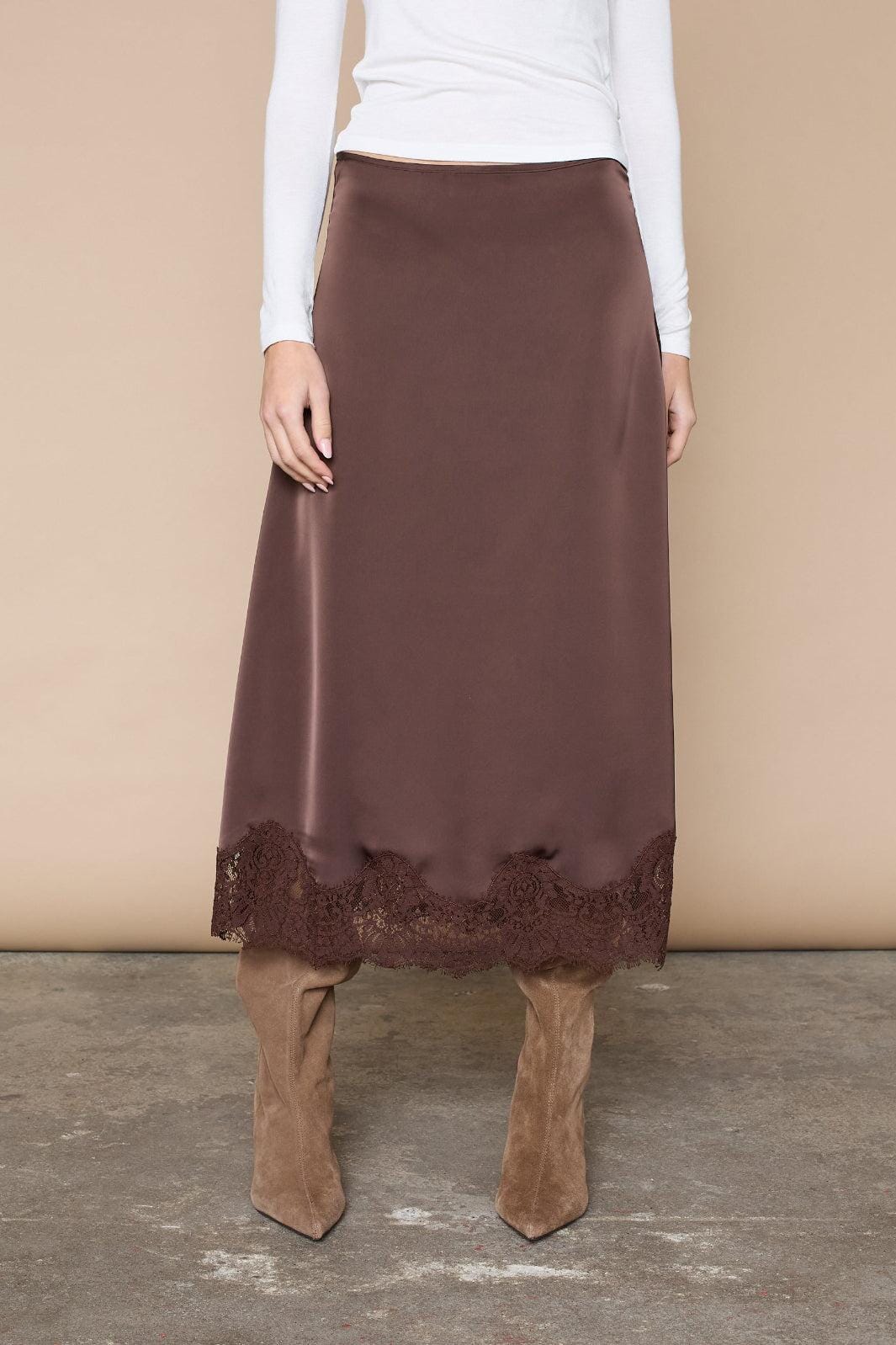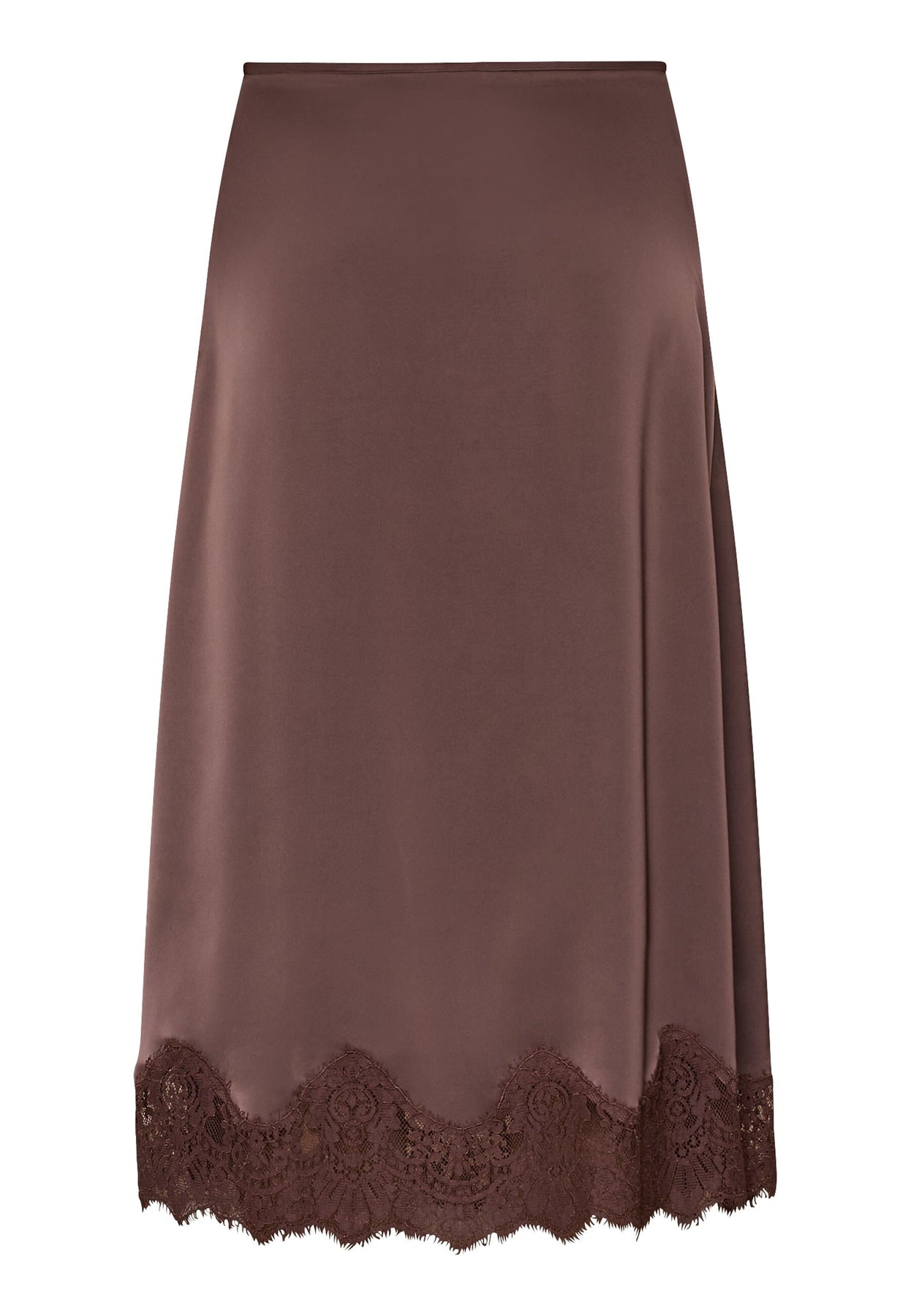 Brunt skjørt fra Love & Divine med blondekant. Skjørtet har en glatt overflate og et A-linjesnitt som gir en lett fasong.