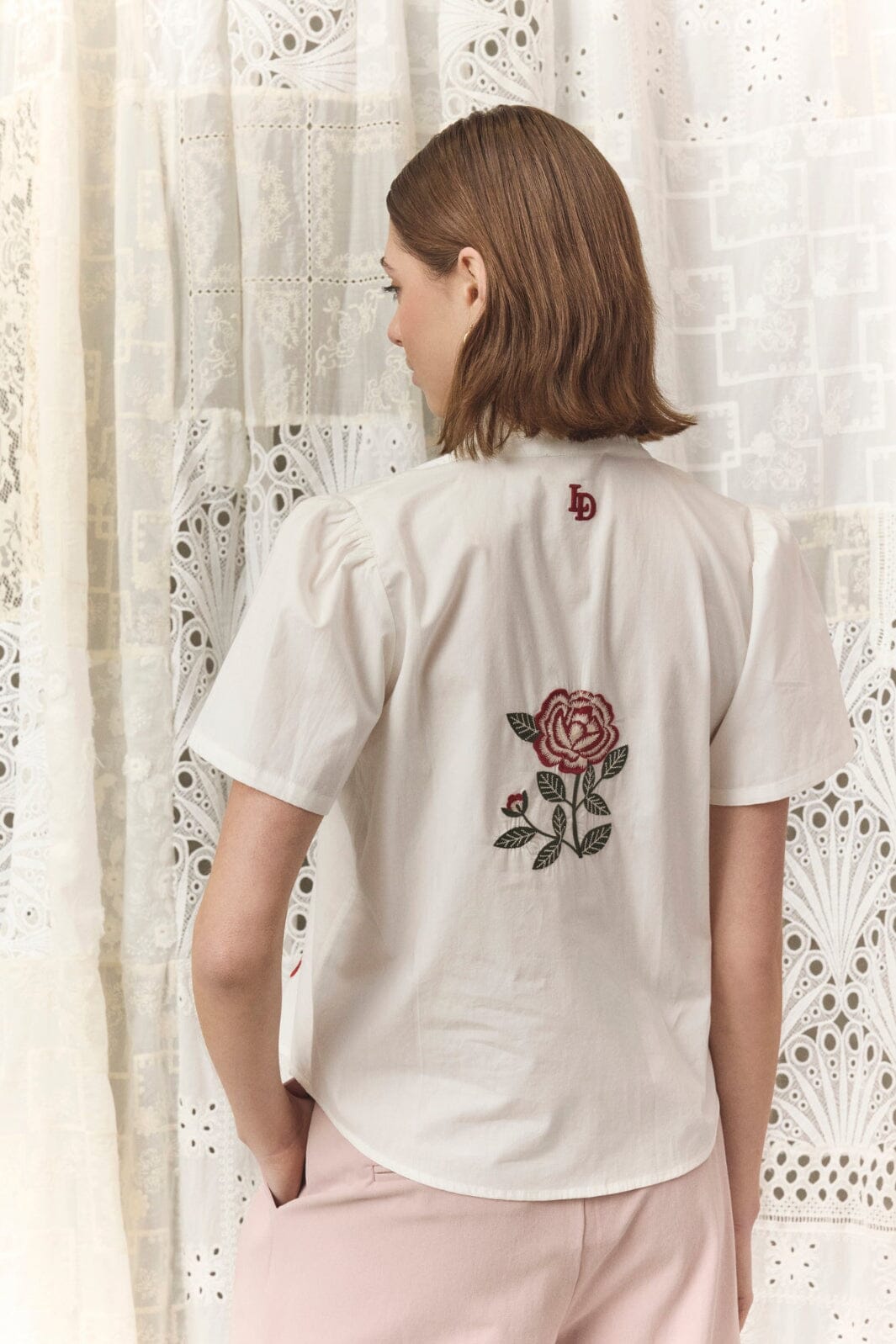 Hvit skjorte fra Love & Divine, laget av 100 % bomull. Skjorten har broderte motiver med sol, blomst og kirsebær samt volanger.