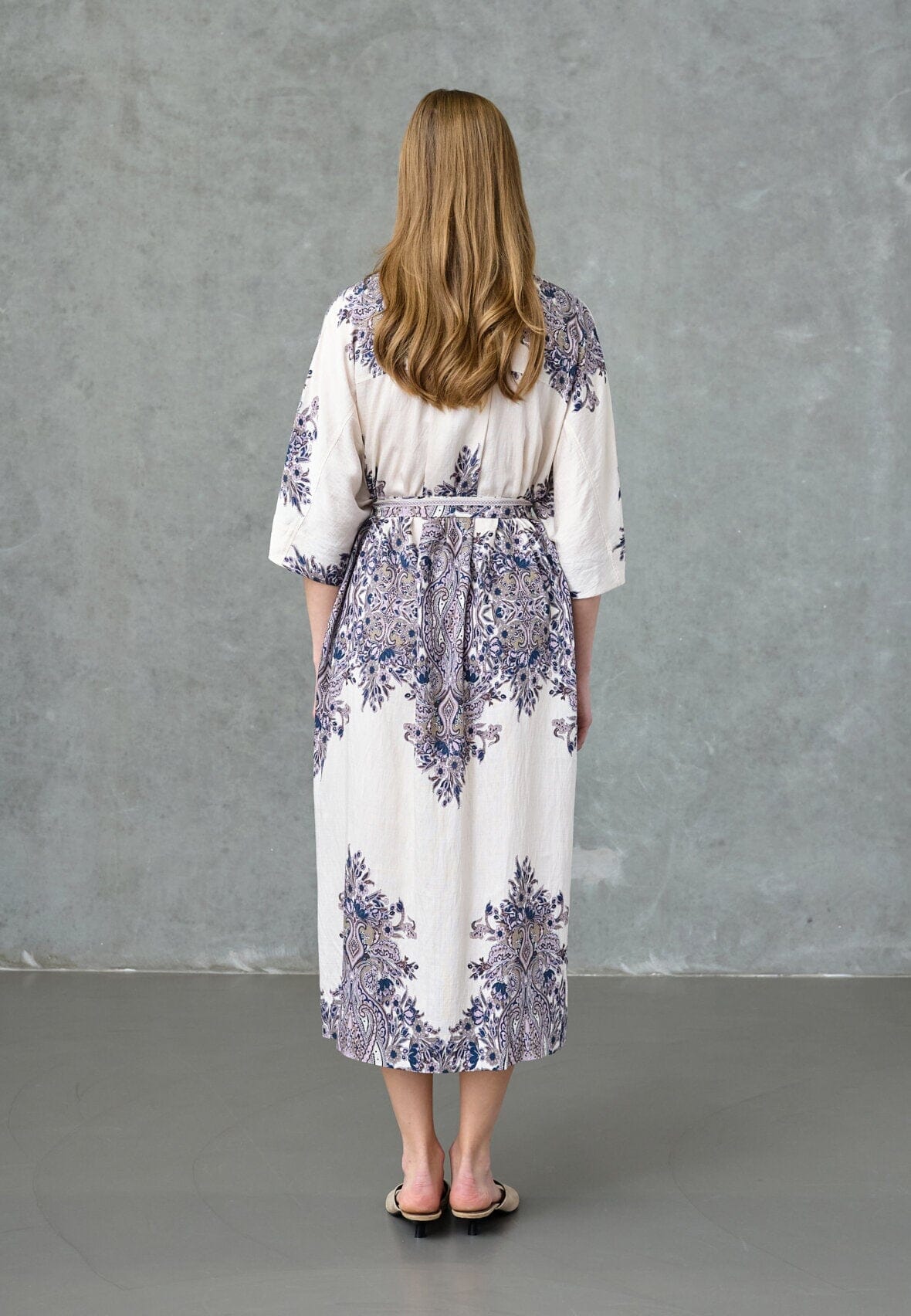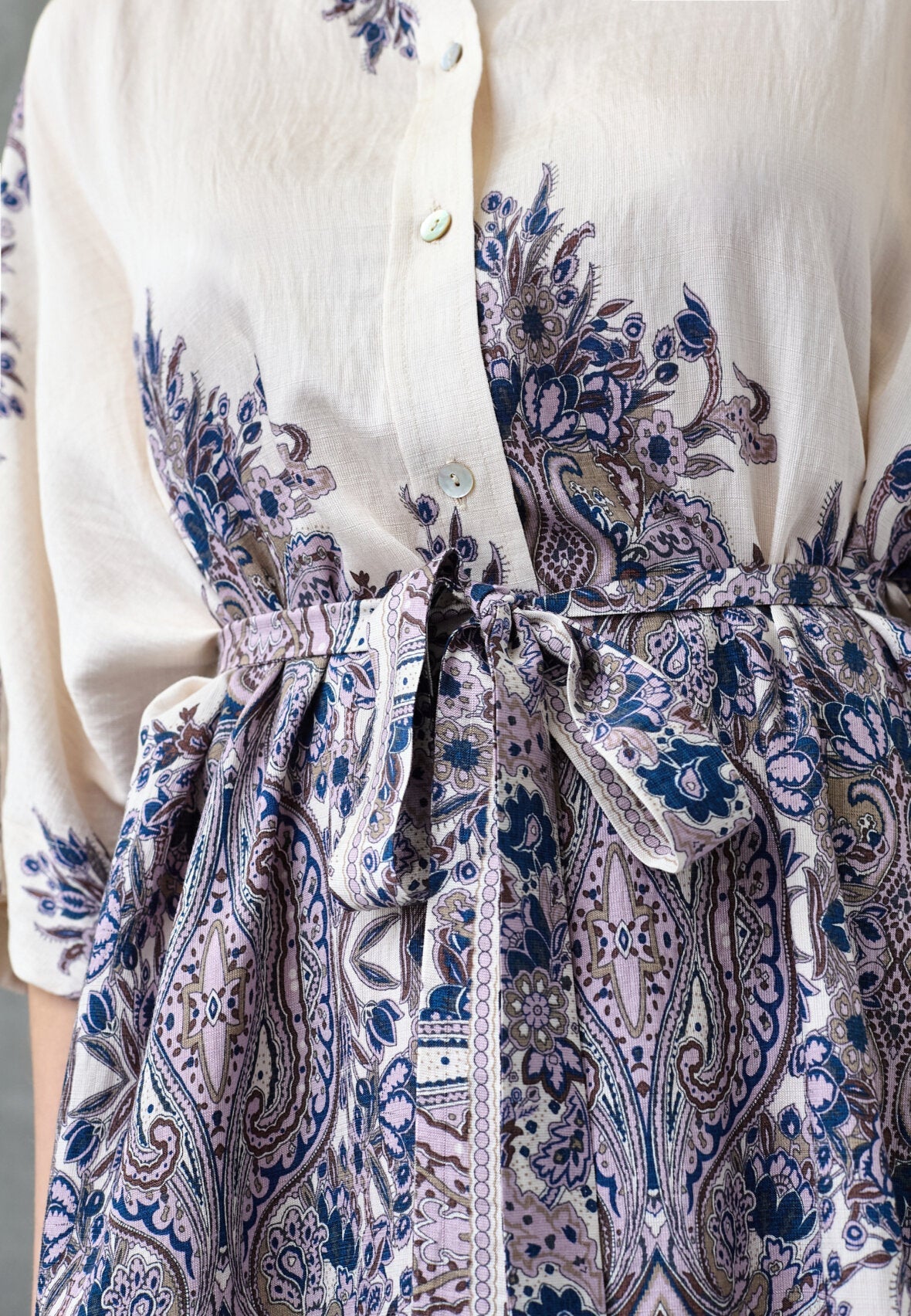 Kjole fra Love & Divine i krem og hvit med paisleymønster i champagne og blå. Kjolen har knappelukking foran og 3/4-ermer.