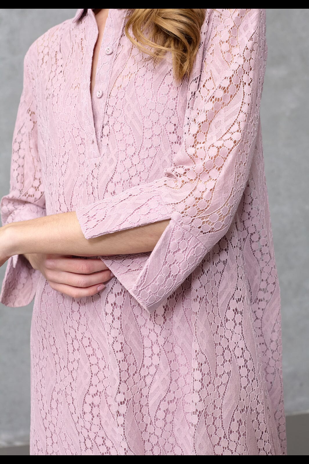Blondekjole fra Love & Divine i en lilla-rosa nyanse. Kjolen har skjortekrage, trekvartsermer og en løs passform.