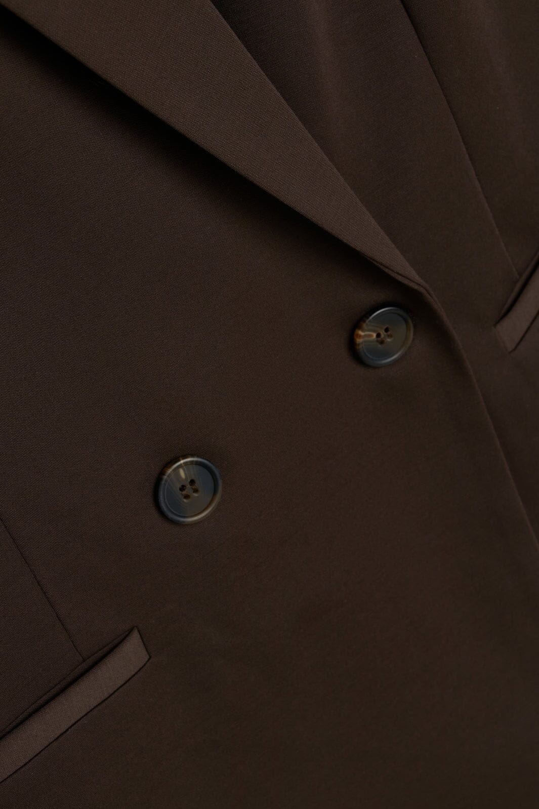 Brun blazer fra Love & Divine i sjokoladefarget stoff. Blazeren har en klassisk slagkrage og dobbeltknapplukking, noe som gjør den egnet for formelle anledninger.