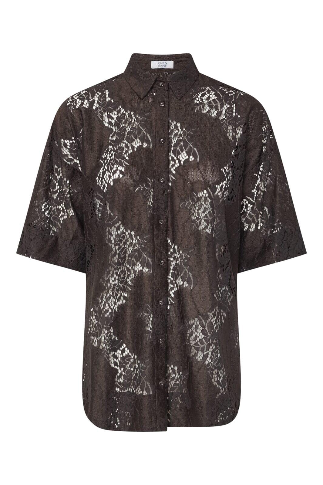 Mørkebrun skjorte fra Love & Divine med blonder. Skjorten har en løs passform, korte ermer og en klassisk skjortekrage med knappelukking foran.