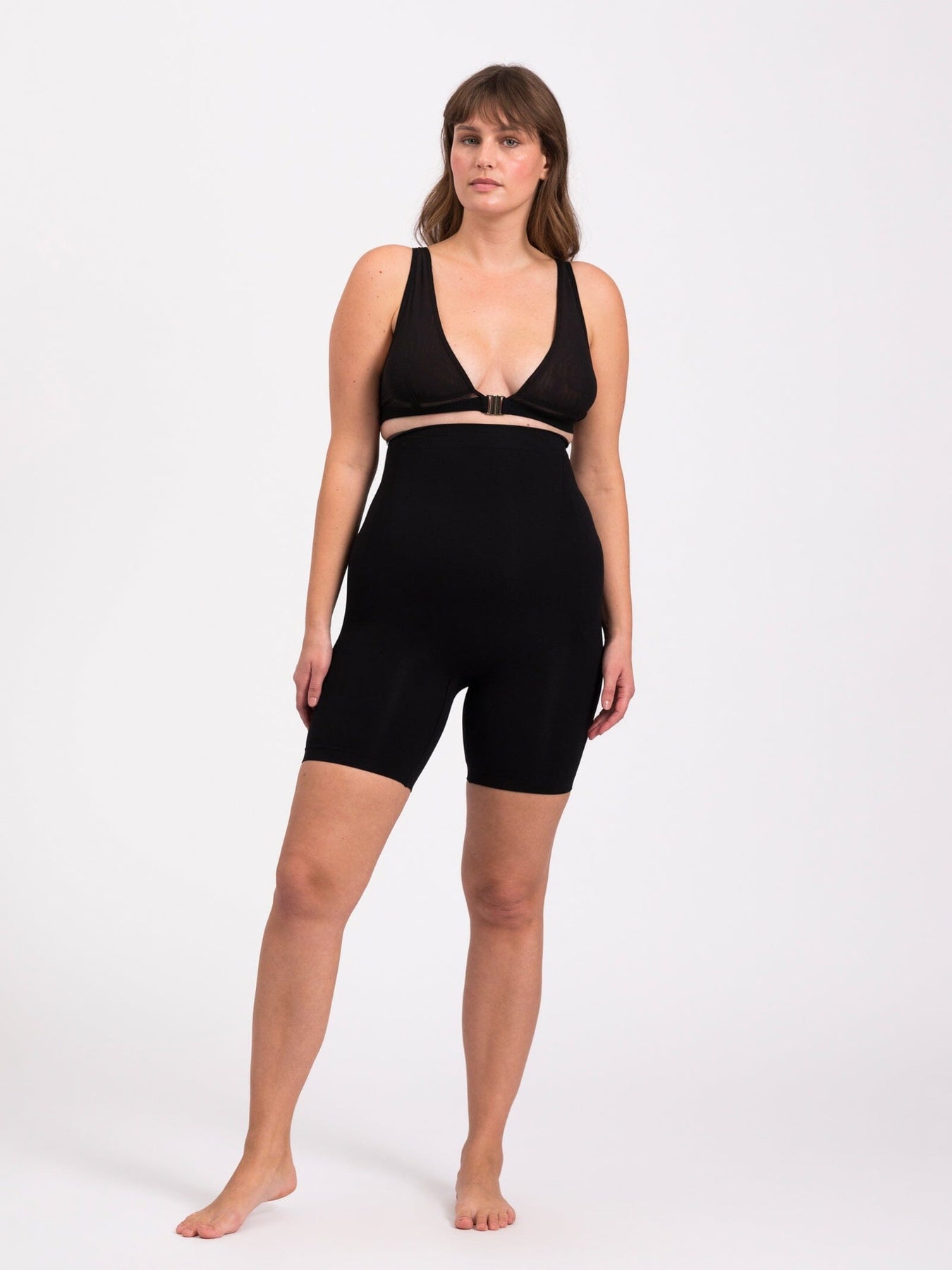 Bukser med shaping fra Lykkeland Ateliér med høy midje. De tettsittende buksene har silikonbånd i midjebåndet og gir støtte til magen, sidene og lårene.