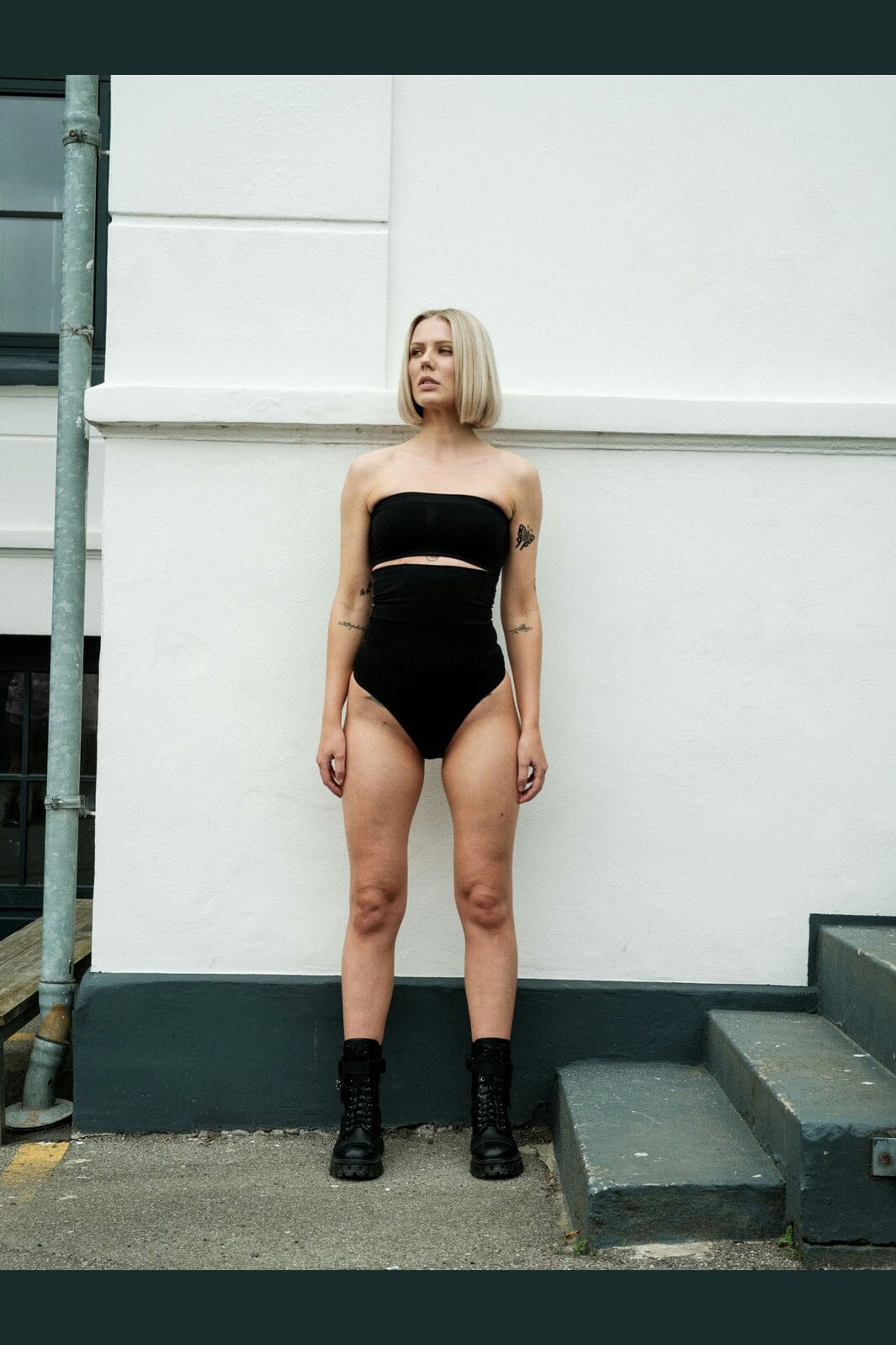 Svart bandeau-bh fra Lykkeland Ateliér med glatt overflate og midtsøm. En enkel bh med rund form og god støtte.