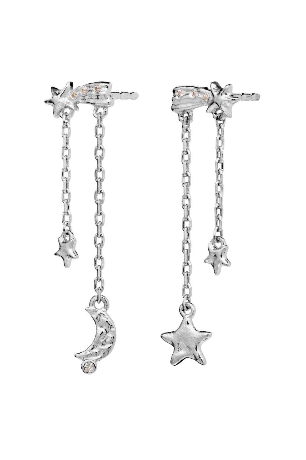 Sølvøredobber fra Maanesten med stjerner og måne i kjededesign. Øredobbene har asymmetriske detaljer og er laget av resirkulert sterling sølv.