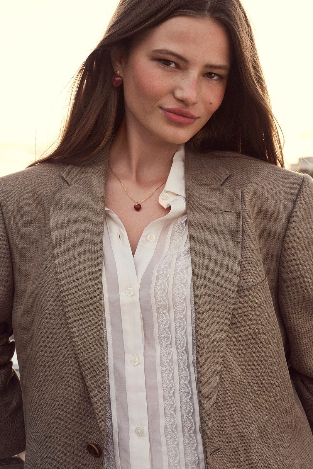 Halskjede fra Maanesten med et hjerteformet anheng i en dyp rød farge. Laget av resirkulert sterlingsølv belagt med 18 karat gull. Kjedet har små ledd og er designet for å sitte tett inntil kroppen.
