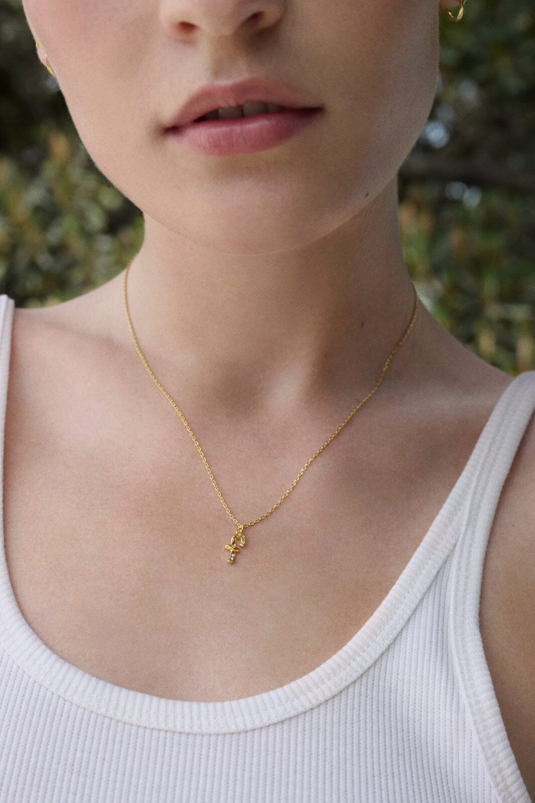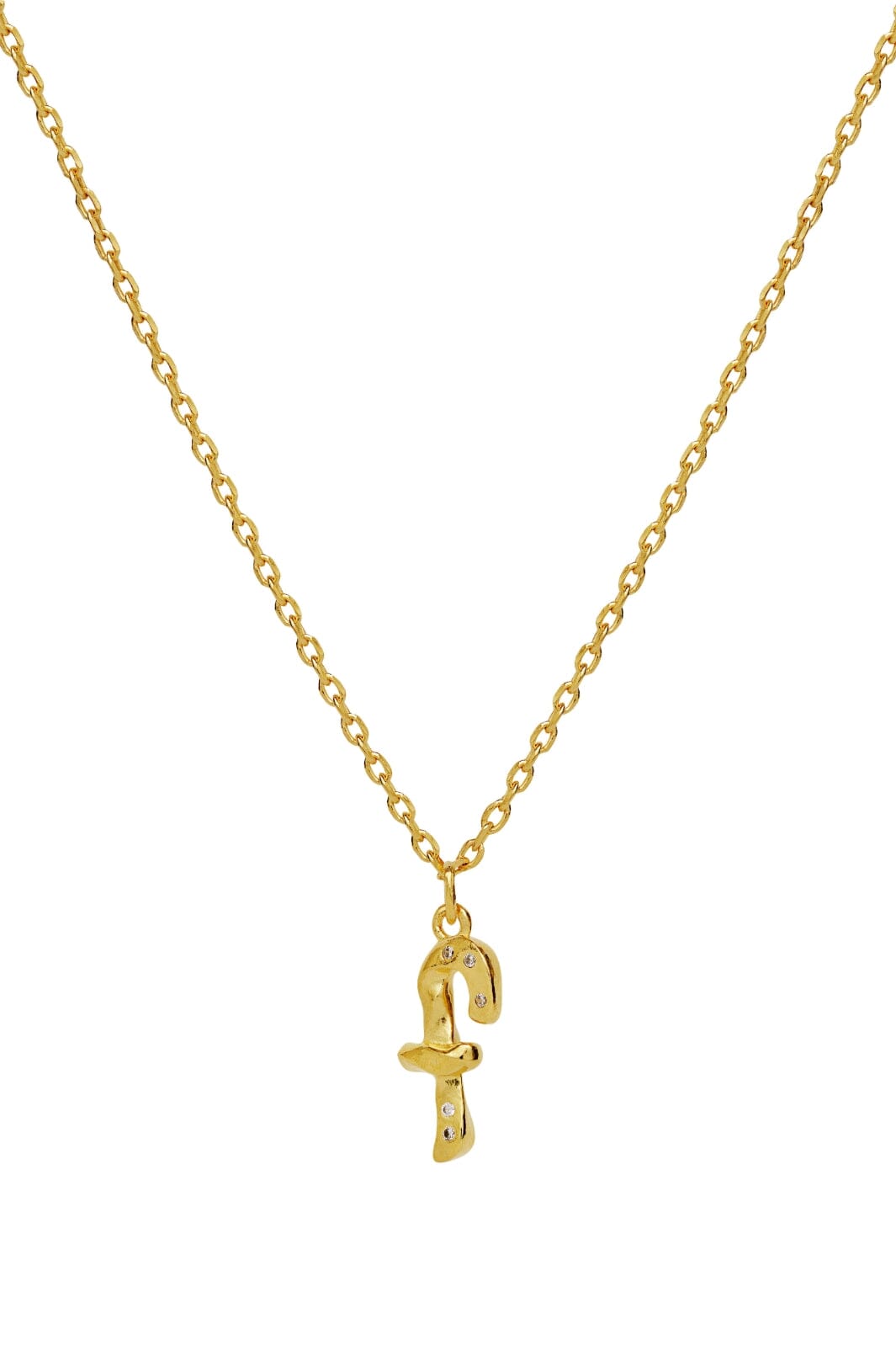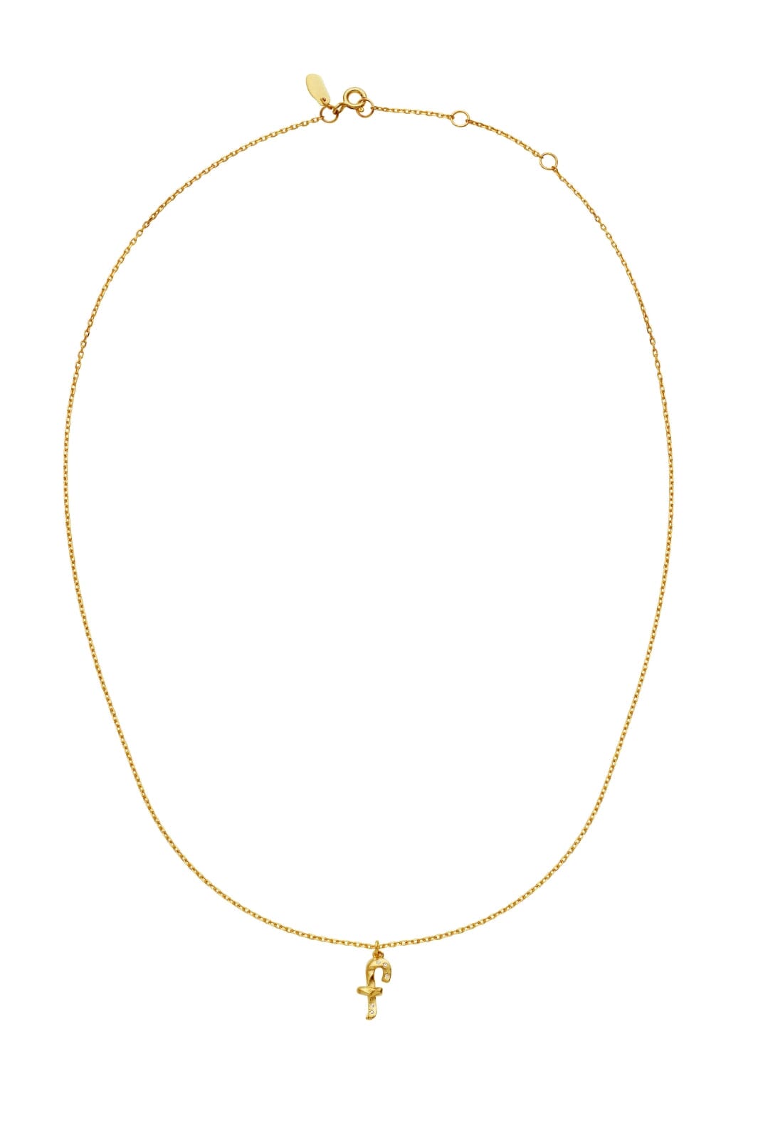 Gullbelagt halskjede fra Maanesten med et F-formet vedheng. Halskjeden er laget av resirkulert sterlingsølv med en 18 karat gullbelagt. Kjedet har en lås og en forlengelseskjede.
