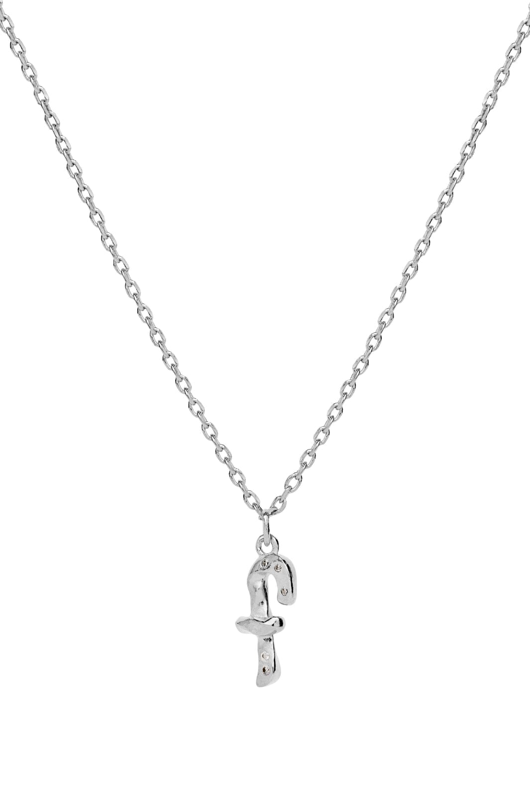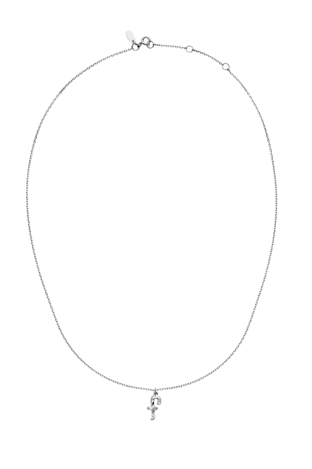 Sølvkjede fra Maanesten med et F-formet vedheng. Kjedet er laget av resirkulert sterlingsølv med en blank overflate og har en justerbar kjede.