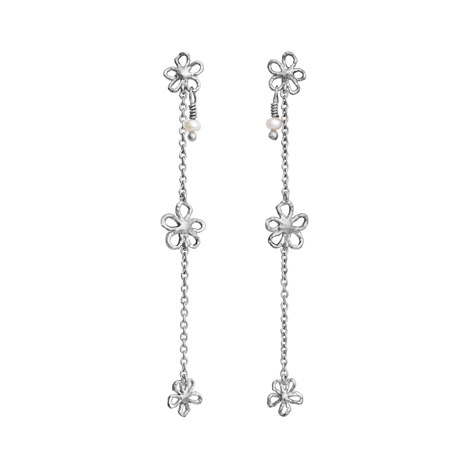 Øredobber fra Maanesten med blomsterdesign og kjedeelementer i sølv. Designet har et nostalgisk uttrykk inspirert av barndommens somre.
