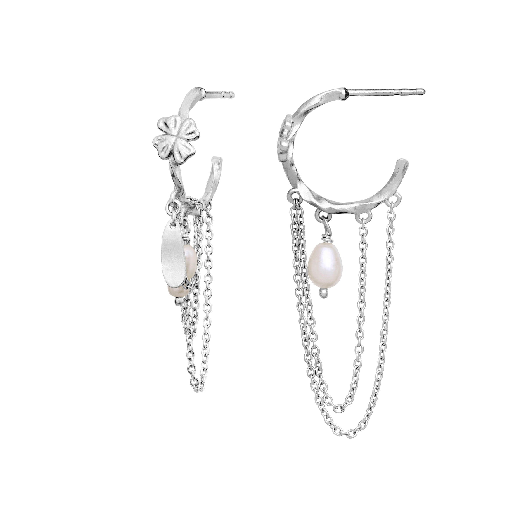 Øredobber fra Maanesten med blomstermotiv og flere kjeder. Designet kombinerer resirkulert sterlingsølv med ferskvannsperler i sølvfarge.