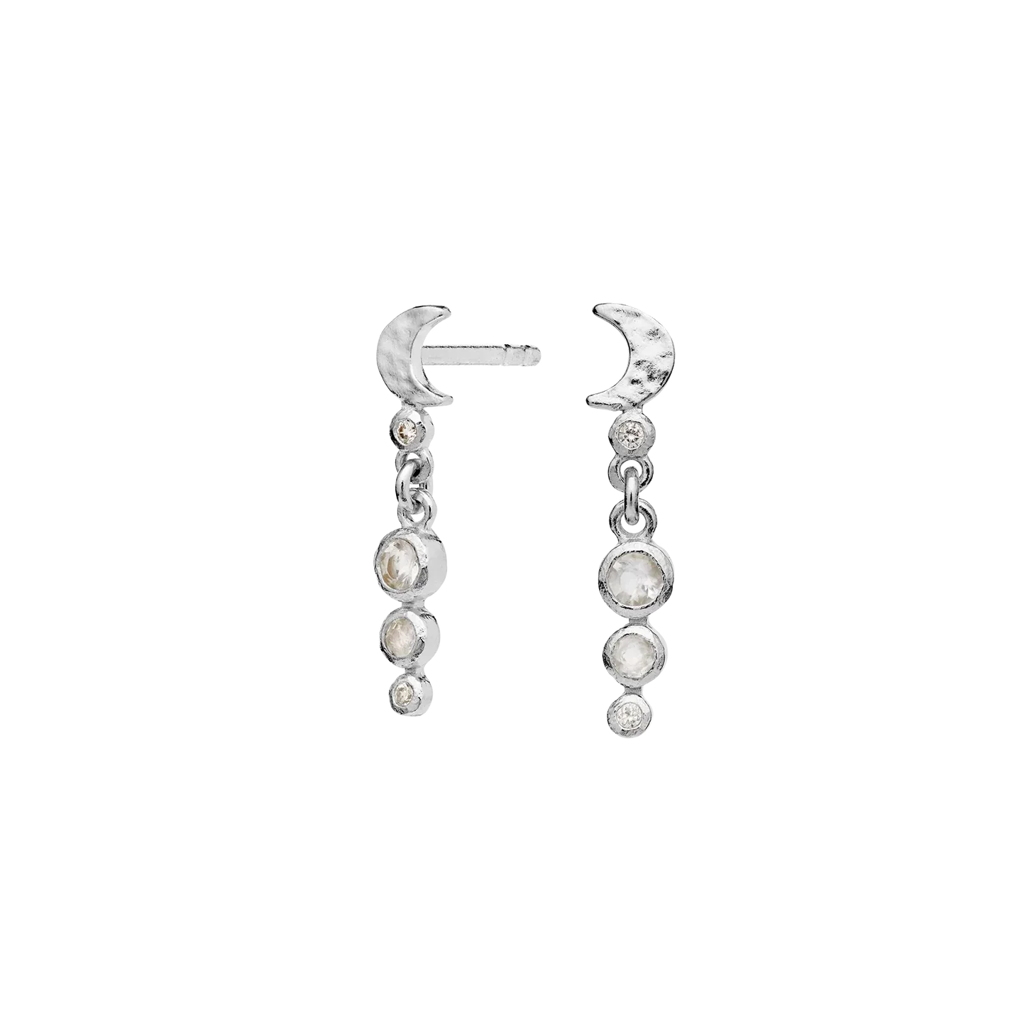 Sølvøredobber fra Maanesten med halvmåneform og hengende steiner. De runde steinene er festet i en kjede under halvmånen og skaper et lett design med fine detaljer.