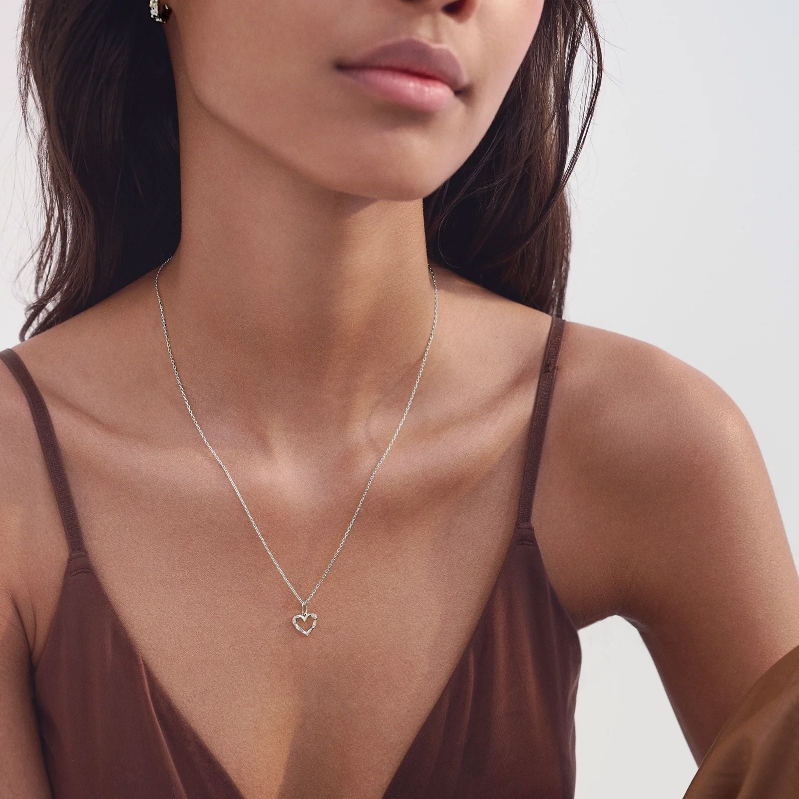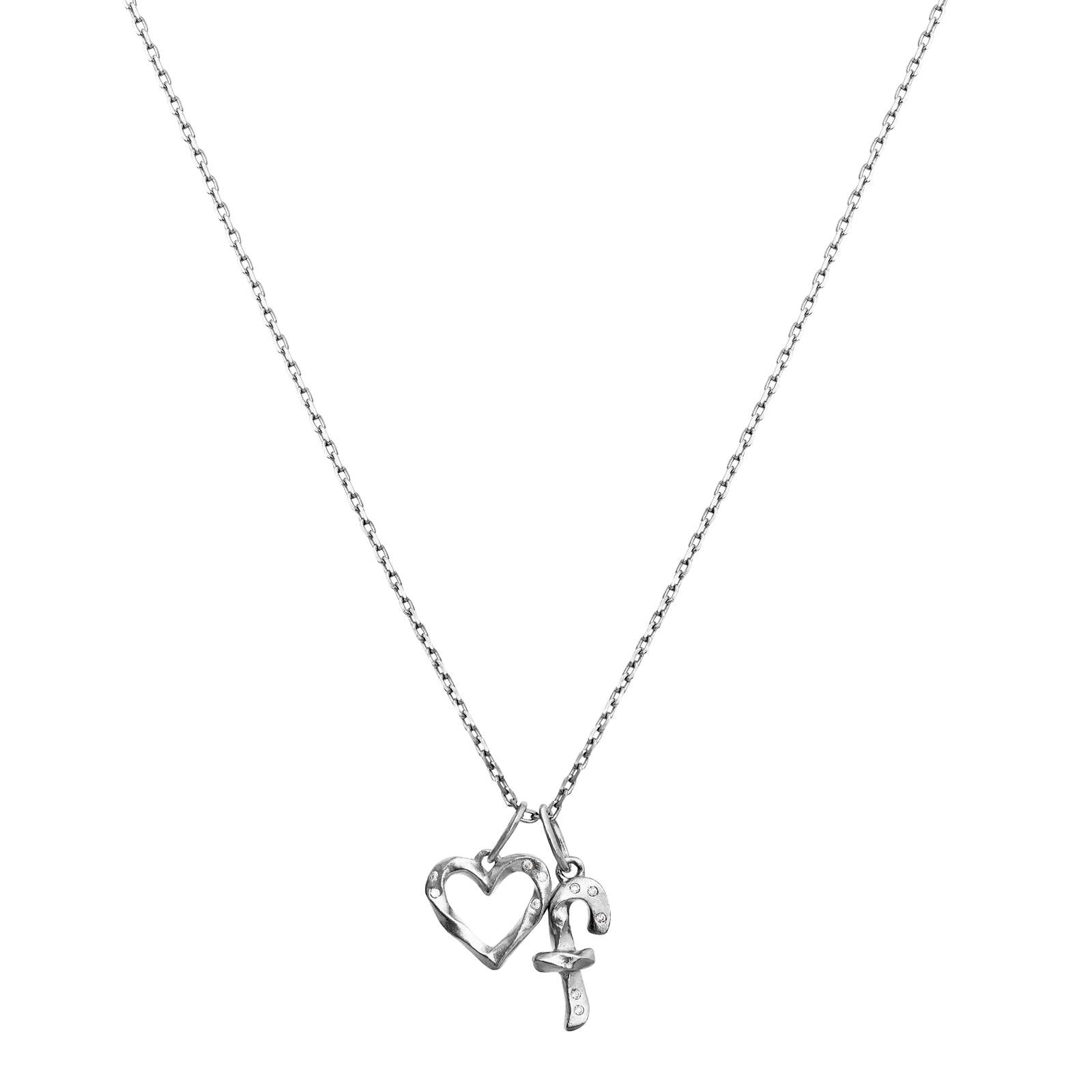 Hjerteformet anheng fra Maanesten, laget av resirkulert sterlingsølv. Anhenget har små sirkulære detaljer på overflaten og er sølvfarget.