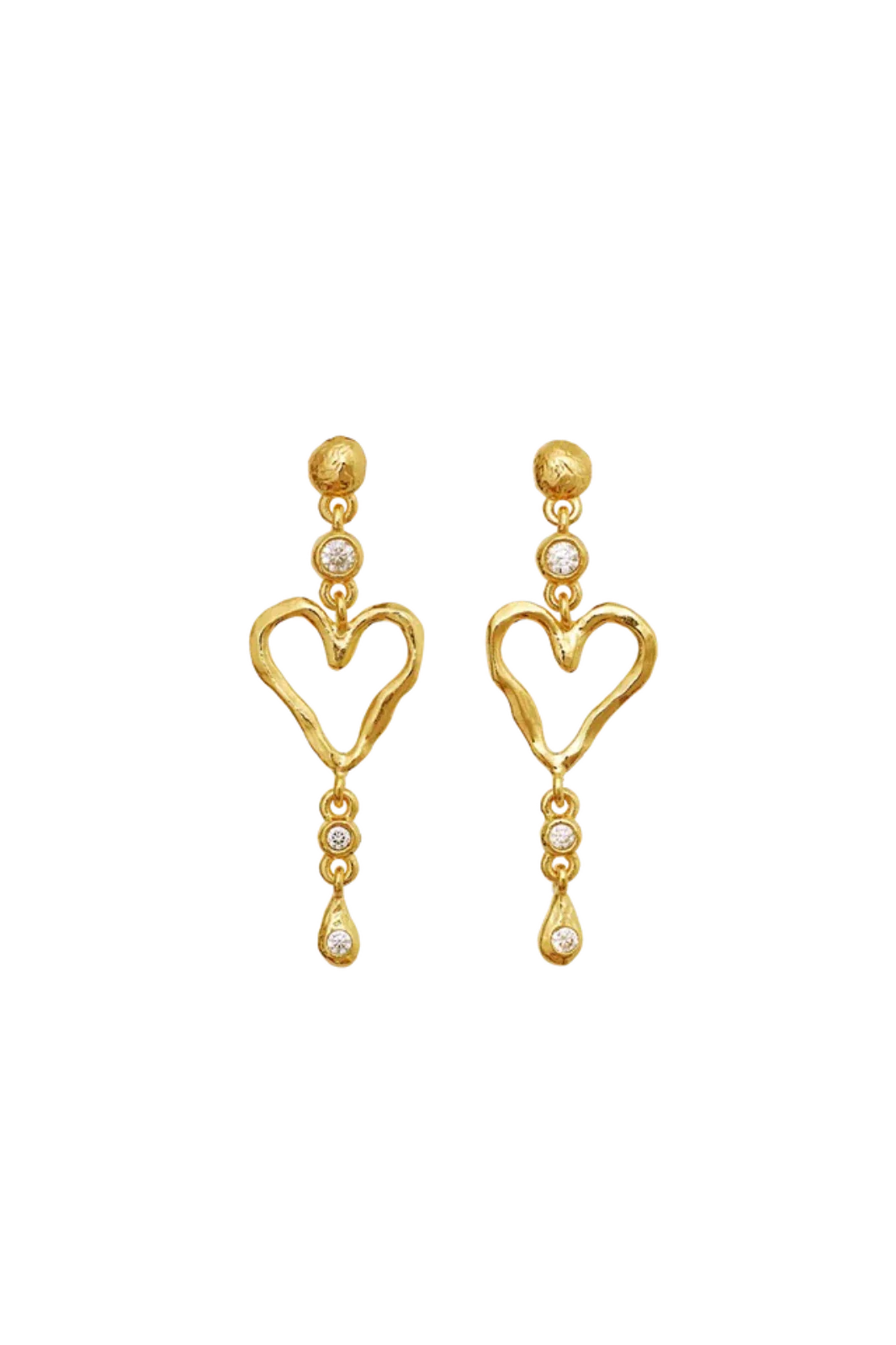 Øredobber fra Maanesten, laget av resirkulert sterlingsølv belagt med 18 karat gull. Det hjerteformede designet har hvite zirkoner langs kjeden.
