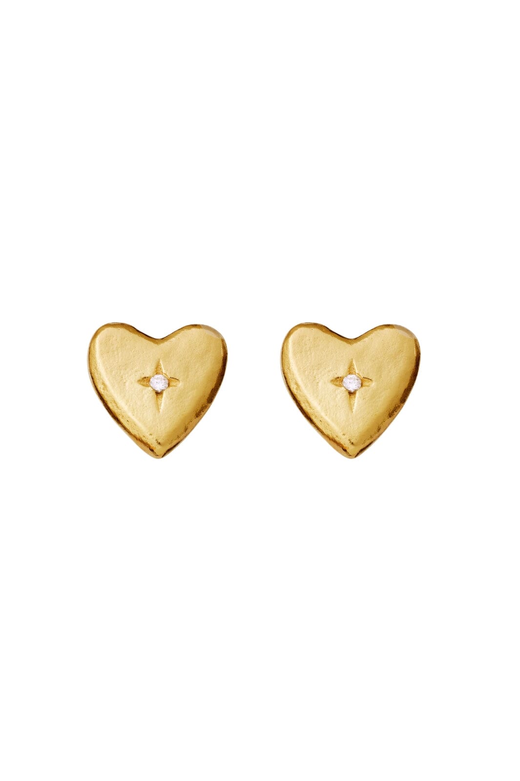 Hjerteformede øredobber fra Maanesten med en liten krystaldetalj i midten. De små øredobbene har en kompakt størrelse på 6 x 6 mm og er laget med en lett konstruksjon.