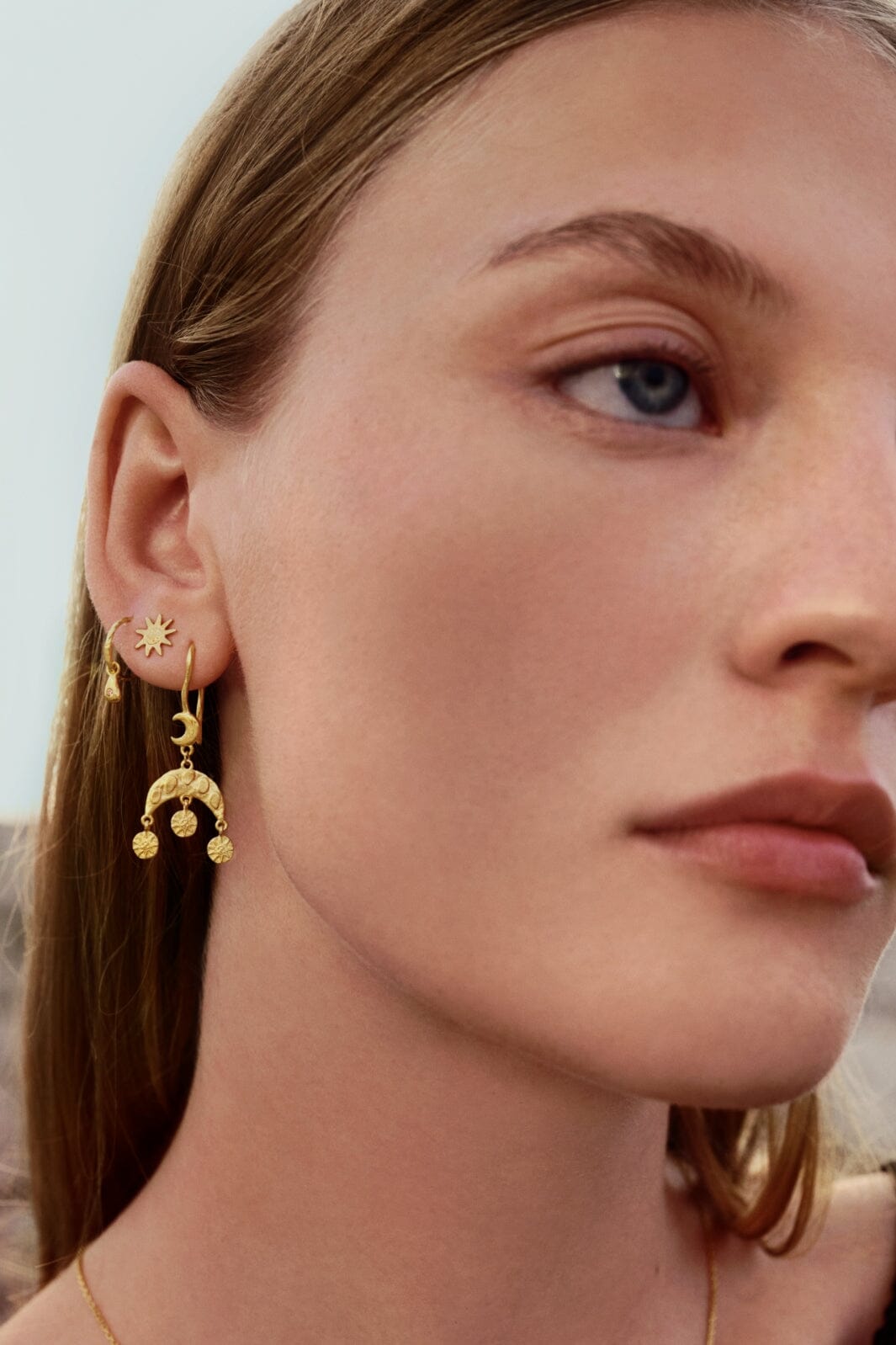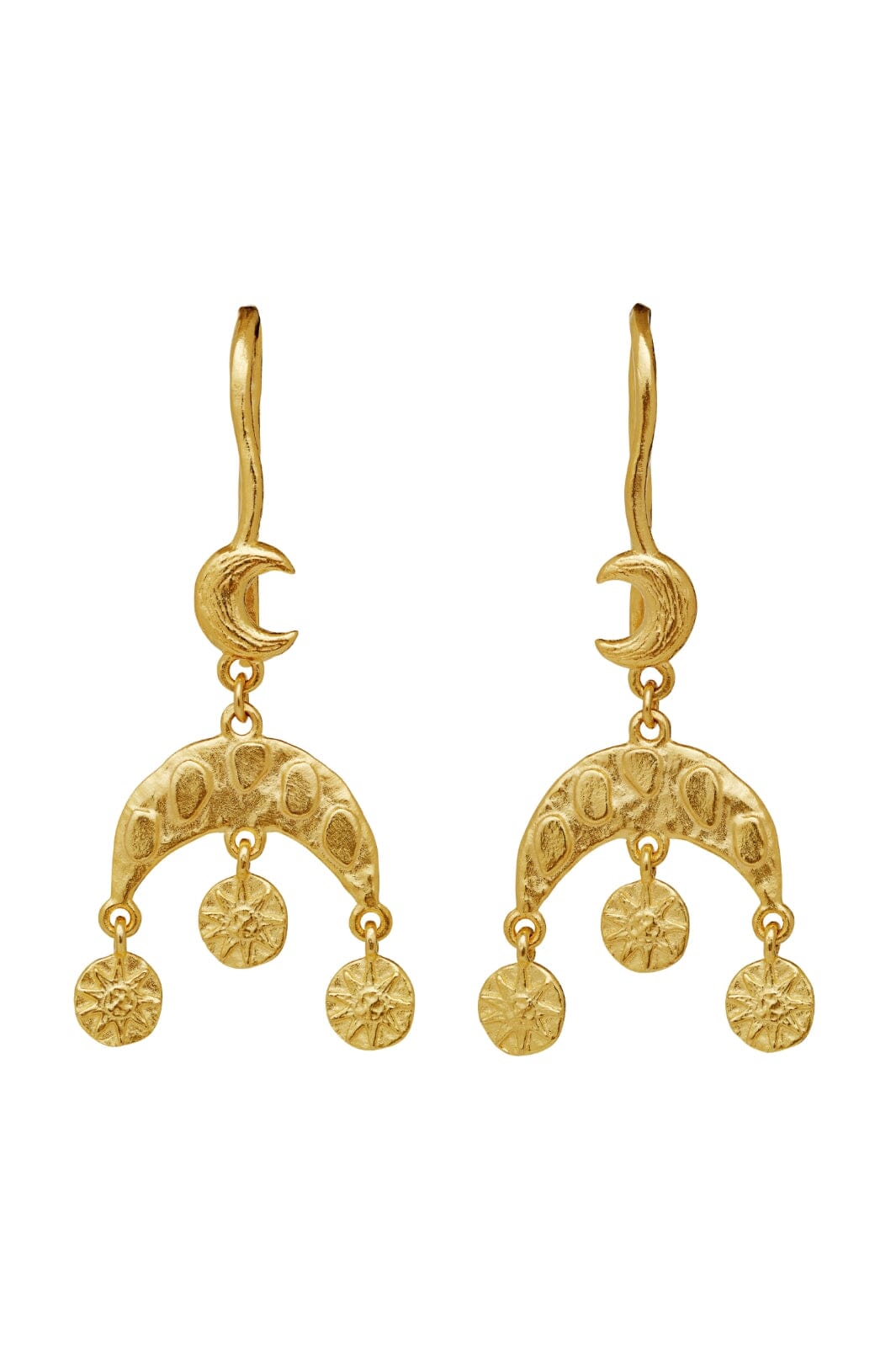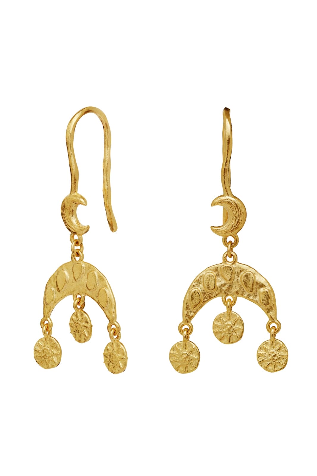 Gyldne øredobber fra Maanesten med halvmåneformet topp og hengende runde skiver. Øredobbene har et design med himmelske motiver og bevegelige elementer.
