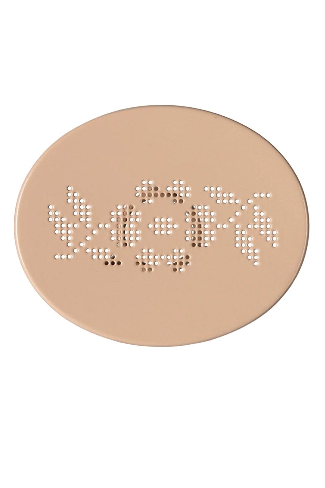 Den rosa metallen har et fint hullmønster på både bord og benk. De små hullene skaper et lett og luftig uttrykk.