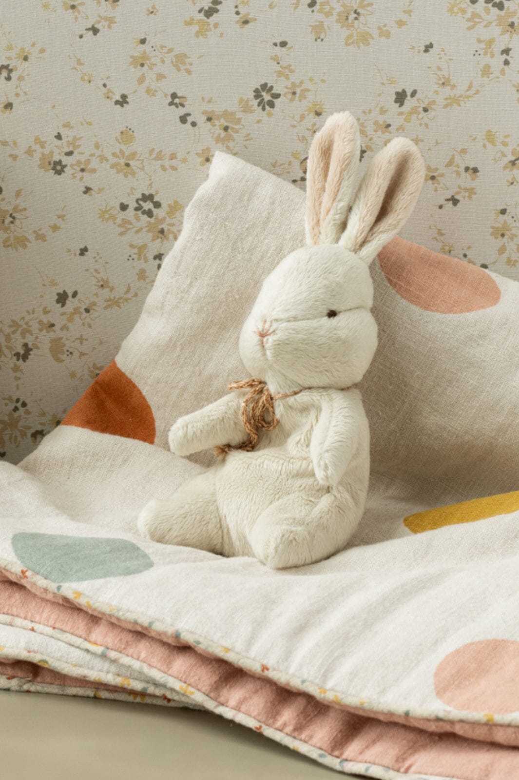 Det myke plysmaterialet gjør kaninen behagelig å holde om og lett for små hender å gripe tak i.