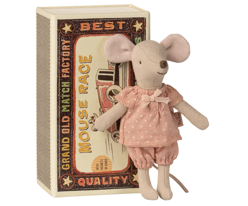 En storesøster-mus i fyrstikkeske fra Maileg. Musen er laget av bomull og kommer i en liten pappfyrstikkeske med vintage-design.
