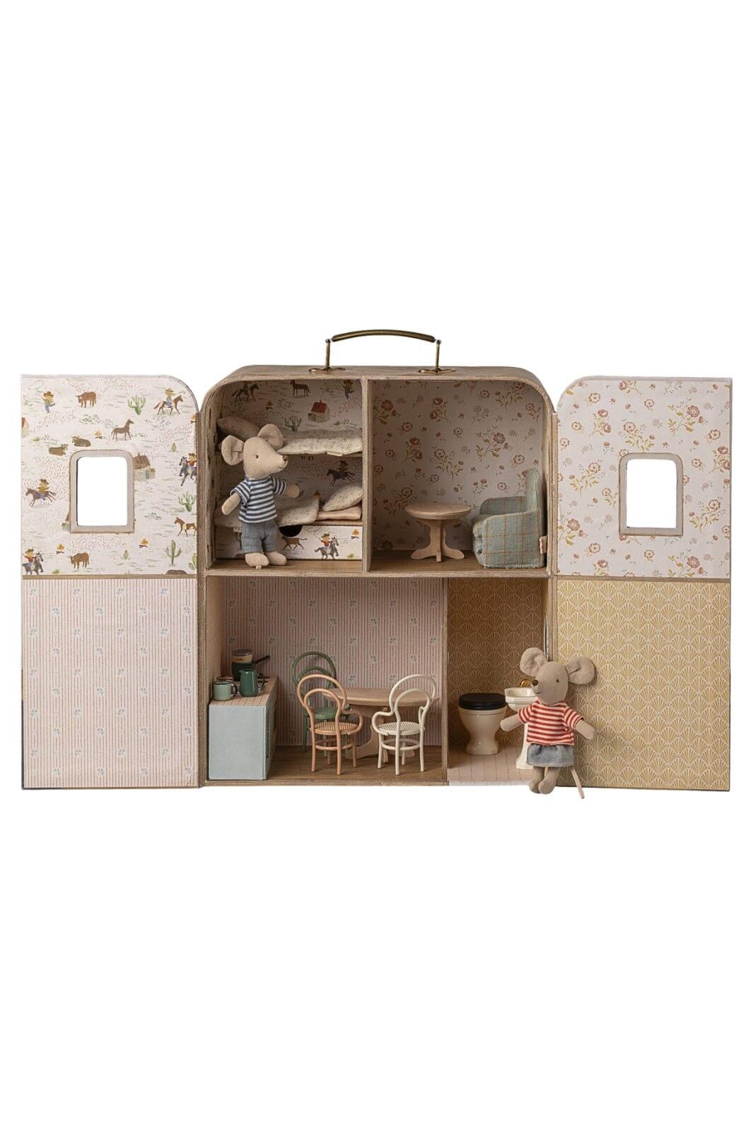En koffert med dukkehus fra Maileg med flere rom dekorert med forskjellig tapet. To musedukker i henholdsvis stripete genser og t-skjorte er inkludert.
