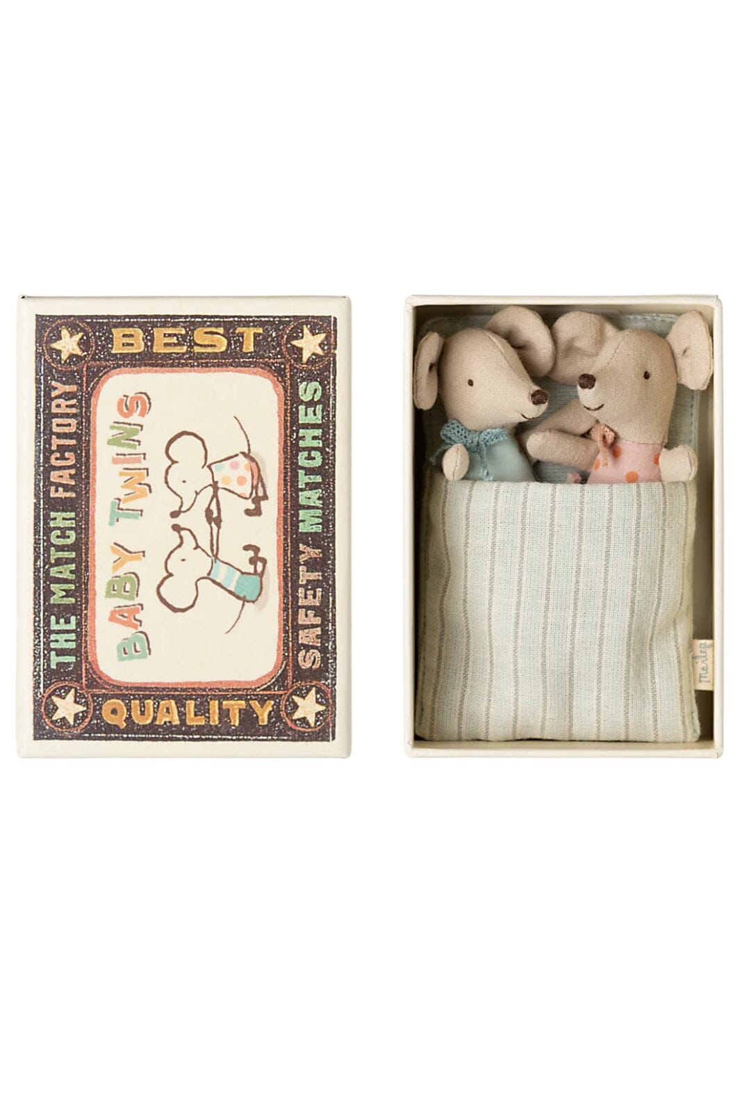 To små mus i en fyrstikkeske fra Maileg. Musene ligger på en stripete pute inne i esken, som fungerer som seng. Fyrstikkesken har et dekorativt design med tekst og illustrasjoner.