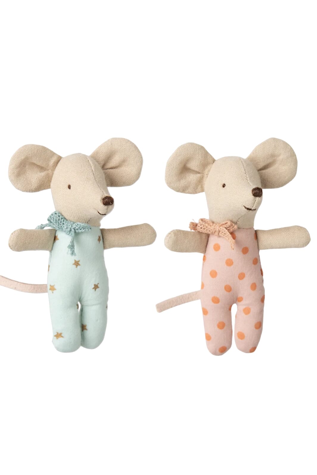 Musene er laget av myk bomullsblanding og har klær i forskjellige mønstre. De er trygge å leke med for barn i alle aldre.
