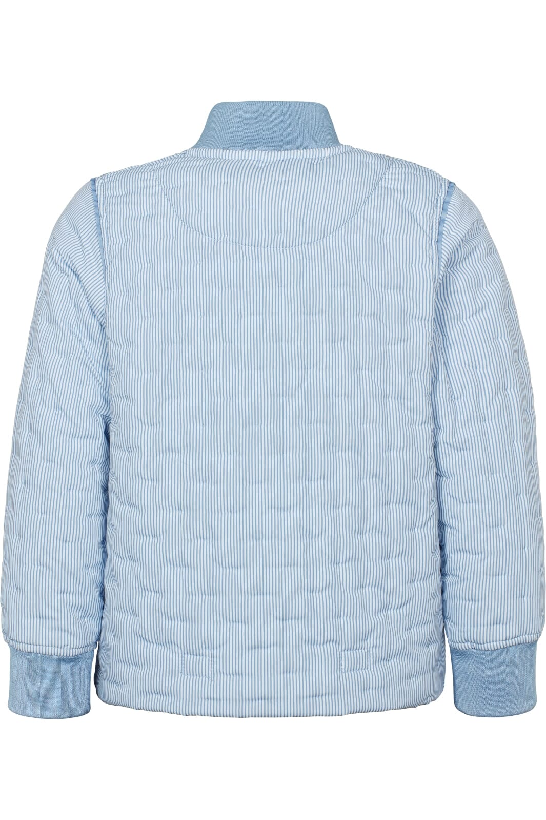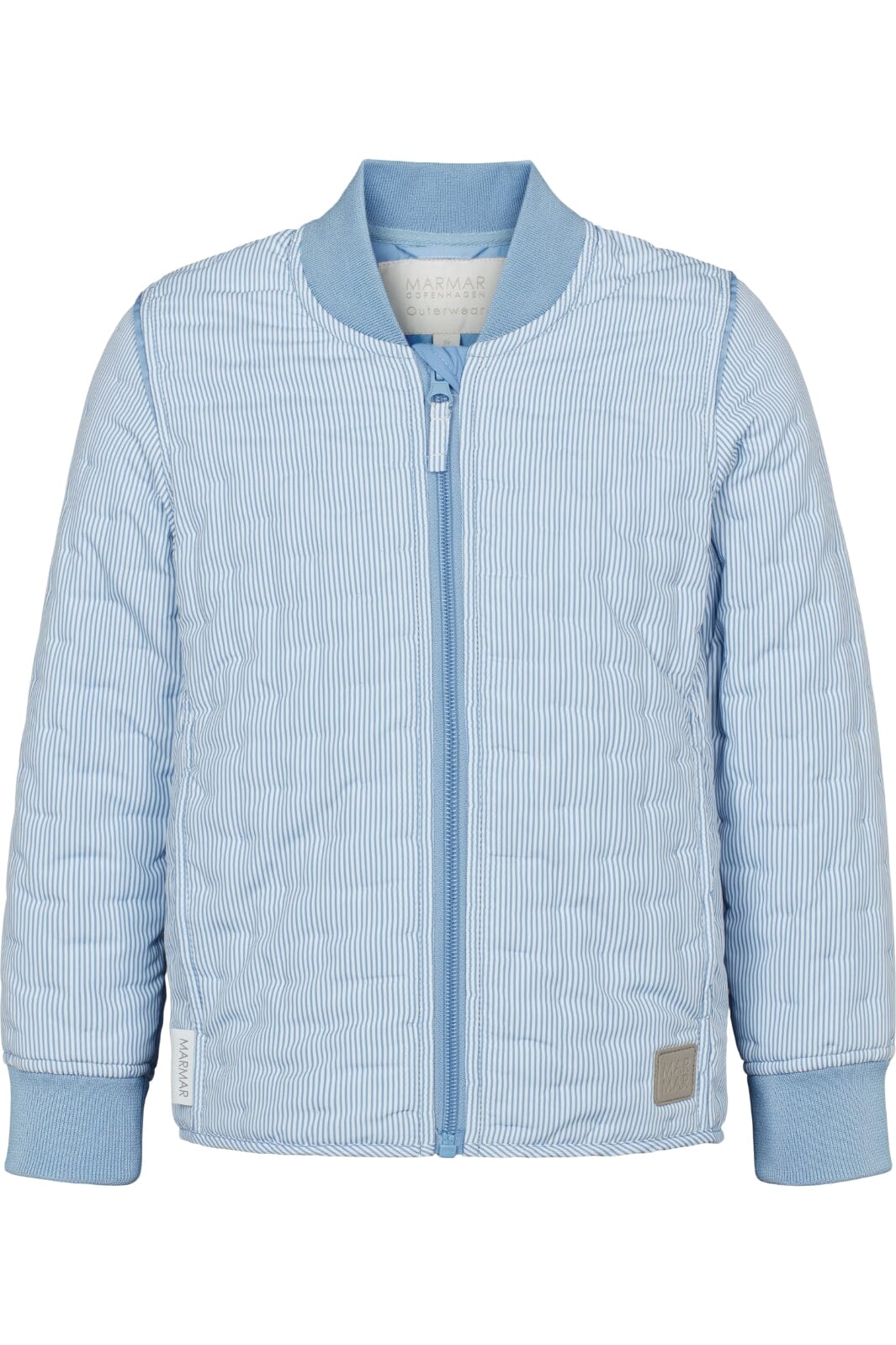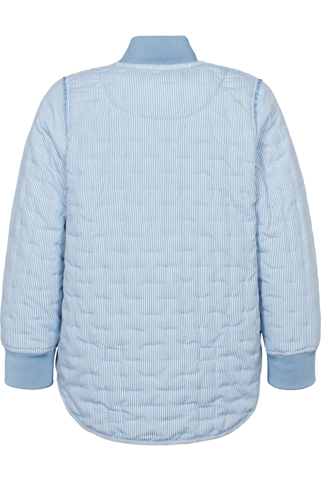 En stripete jakke i lyseblå fra MarMar Copenhagen. Den har rund hals med glidelås og lange ermer med ribbede mansjetter. Dekorative sømmer fremhever det stripete mønsteret.