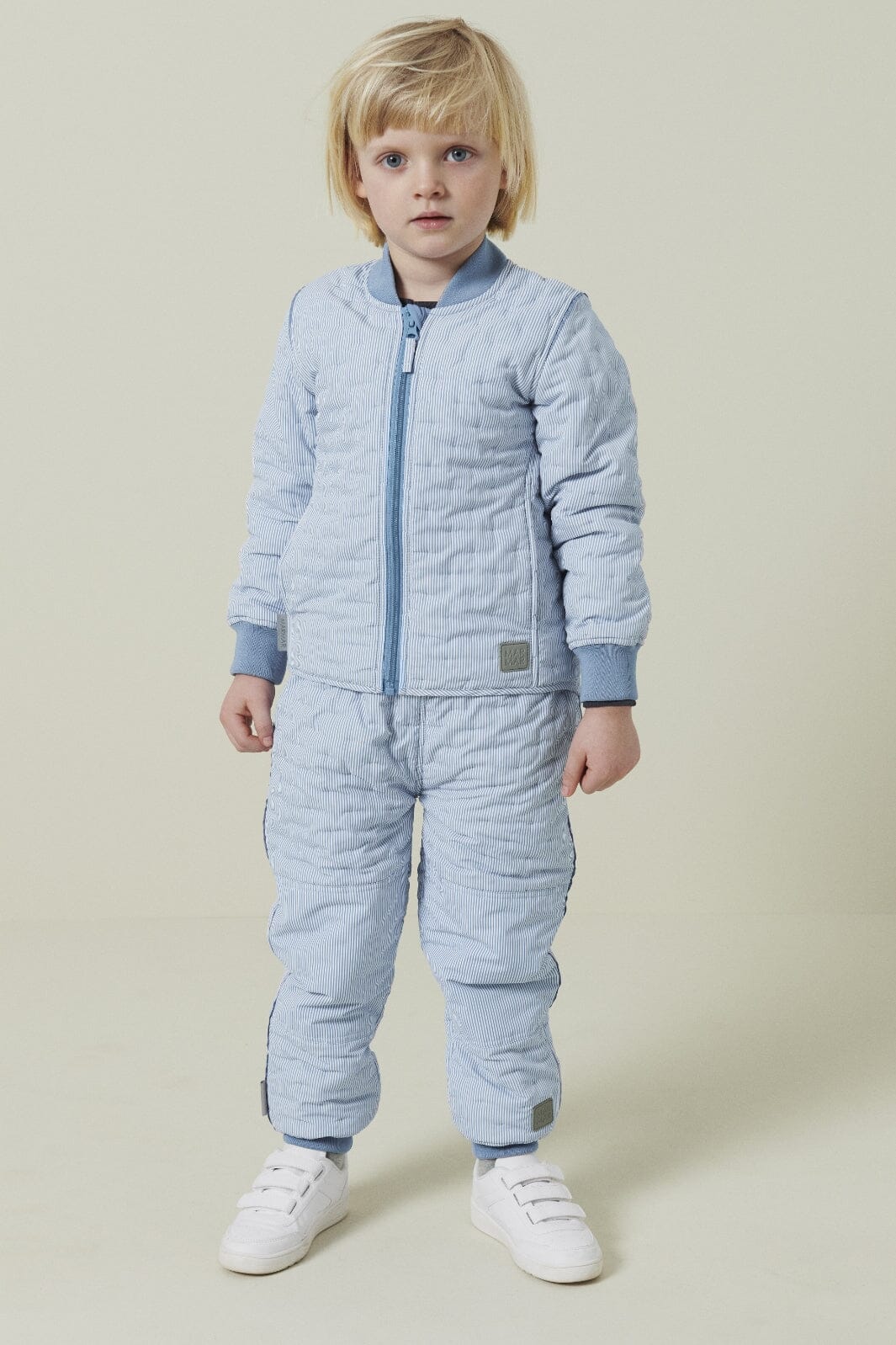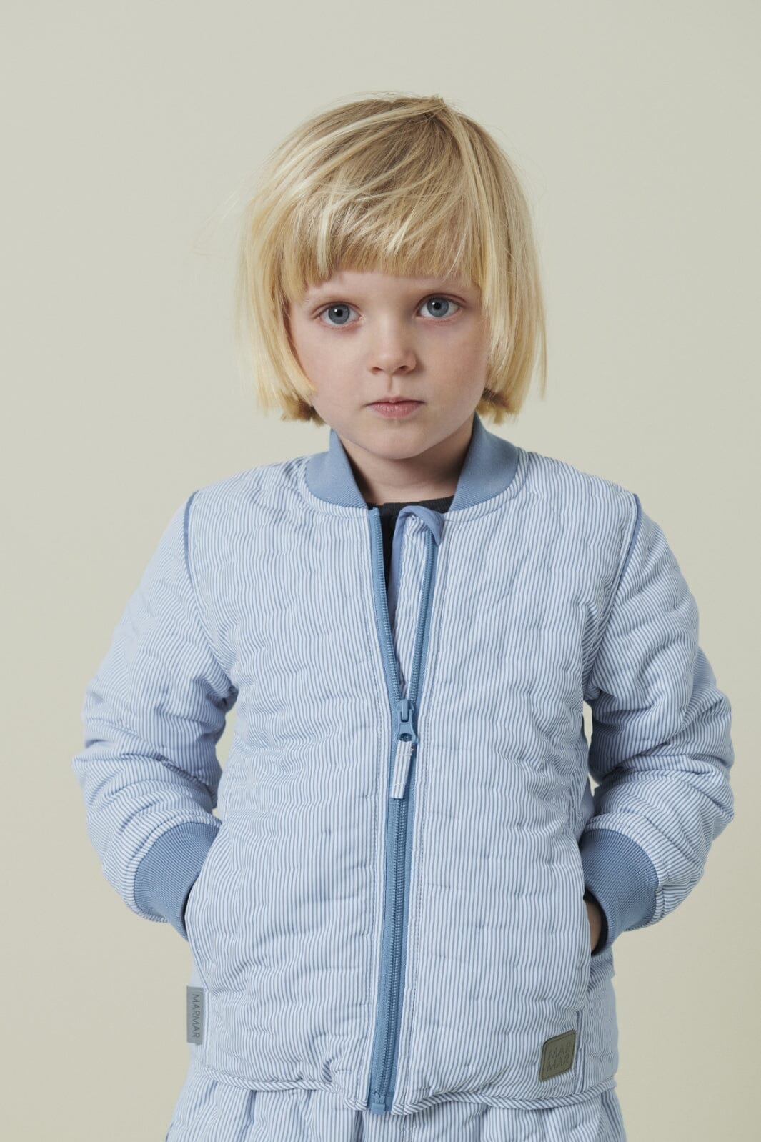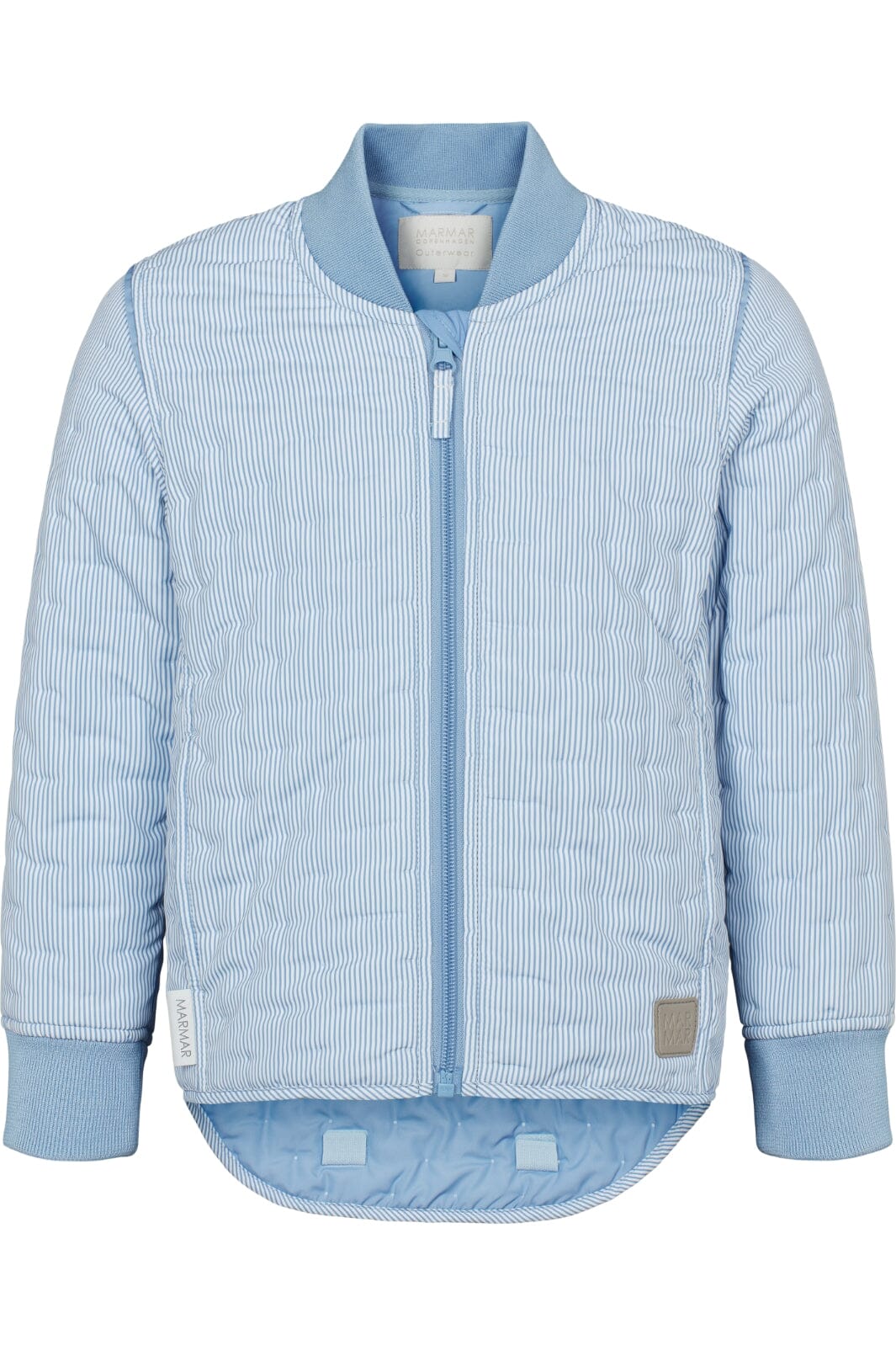 En stripete jakke i lyseblå fra MarMar Copenhagen. Den har rund hals med glidelås og lange ermer med ribbede mansjetter. Dekorative sømmer fremhever det stripete mønsteret.