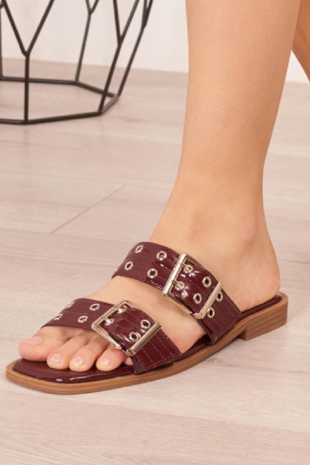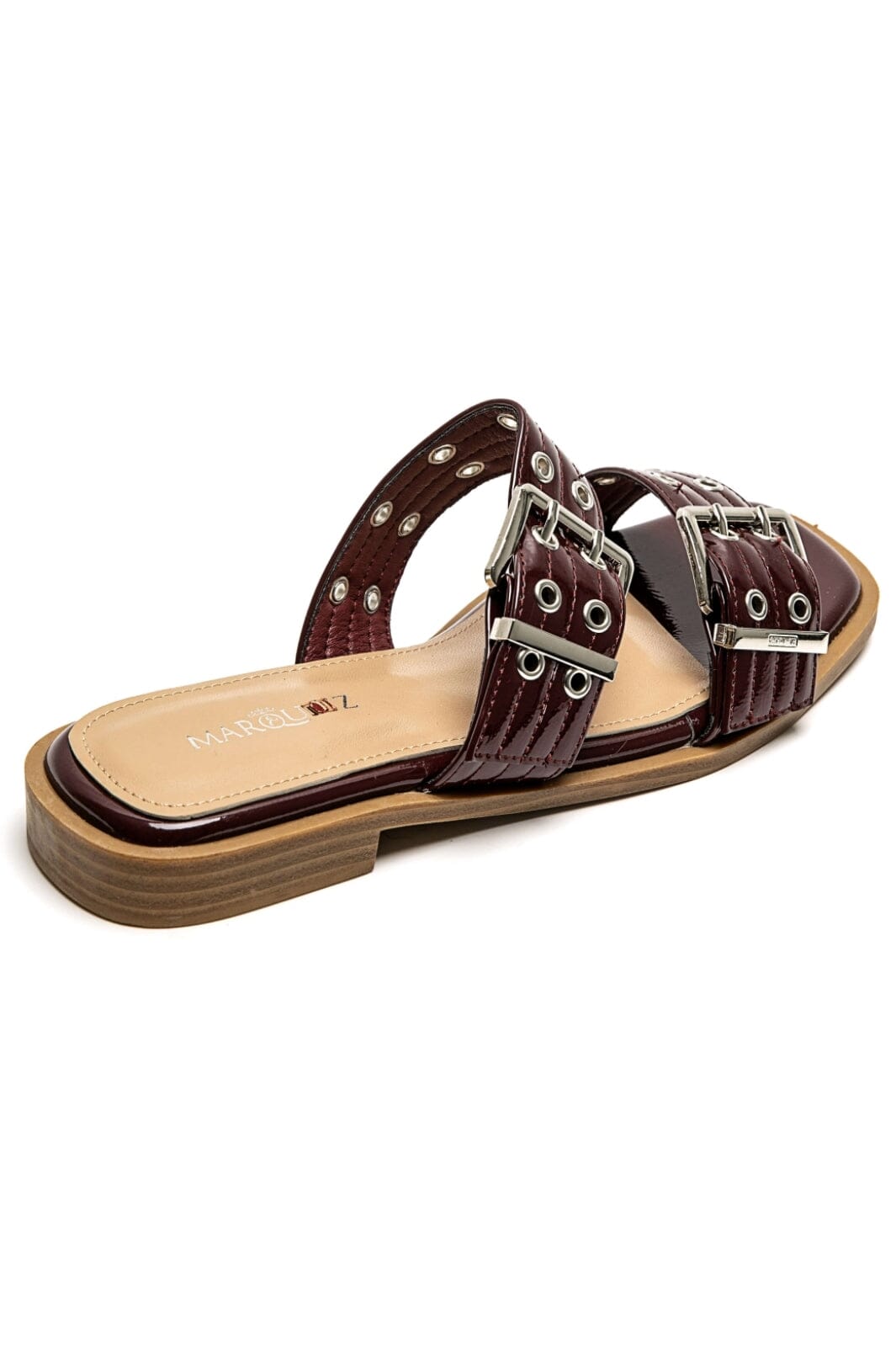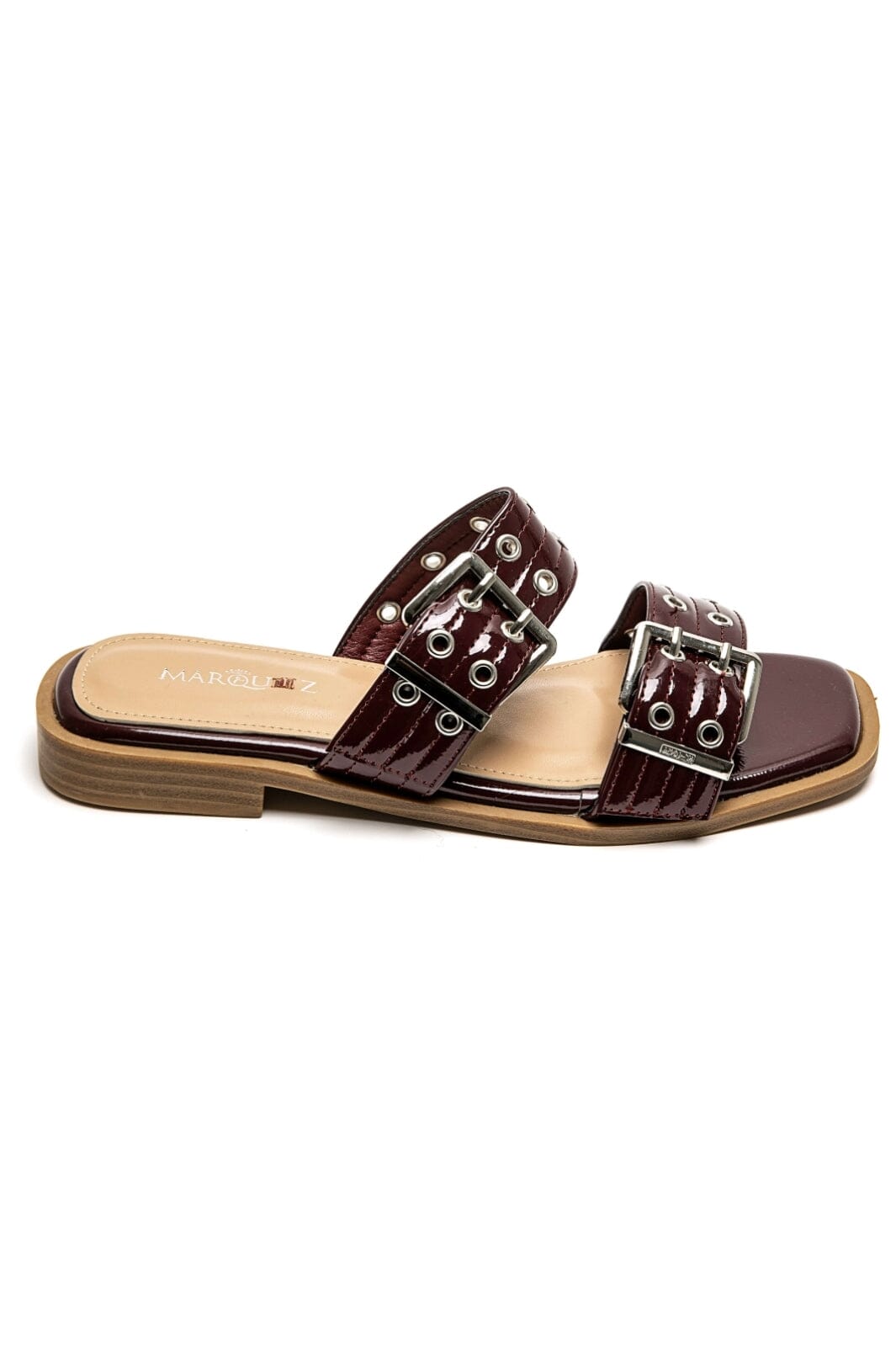 Sandaler fra Marta Du Chateau i en dyp rød nyanse. To brede stropper med spenner gir mulighet for å justere passformen. Den flate sålen har en praktisk høyde.