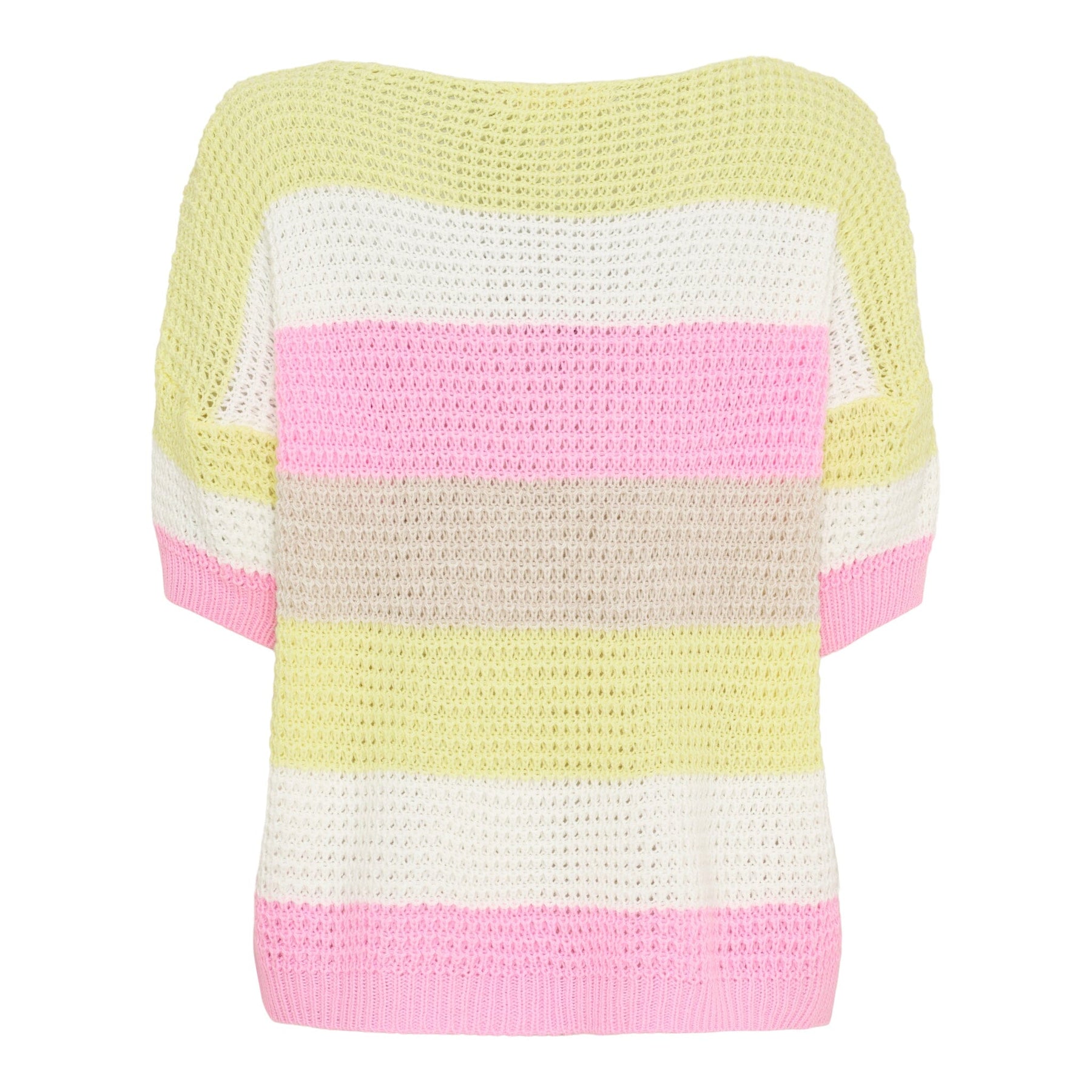 Stripet strikkegenser fra Marta Du Chateau med V-hals og 3/4 ermer. Genseren har striper i gule, rosa, hvite og beige nyanser og en normal passform.