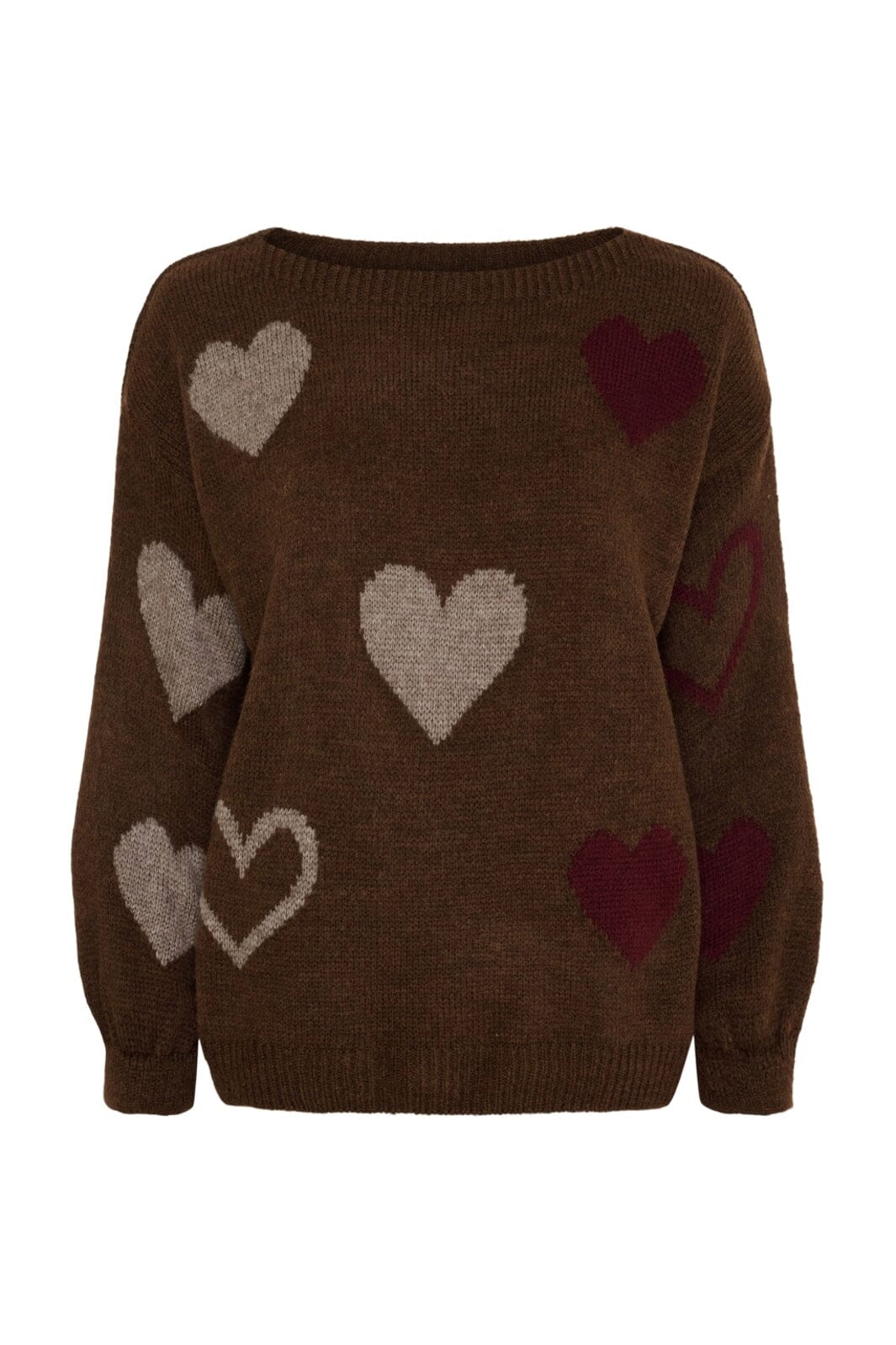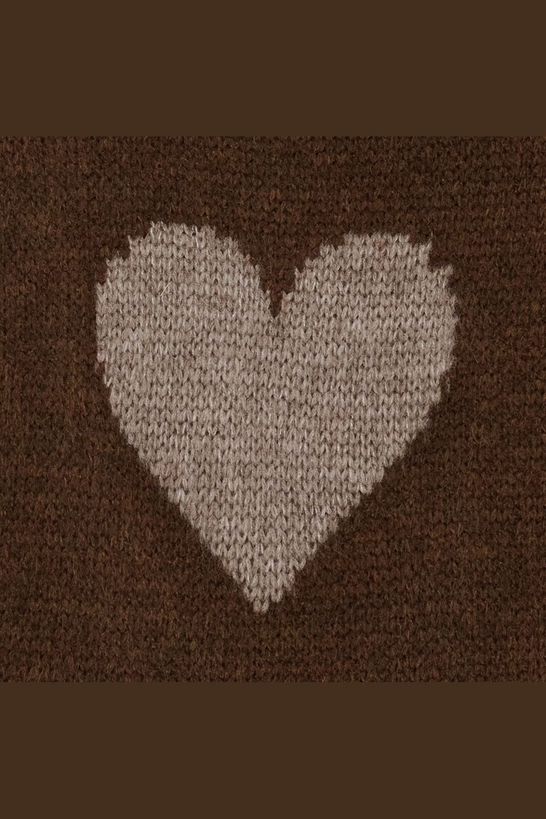 Brun strikk fra Marta Du Chateau med hjerteformede mønstre på forsiden i grått og bordeaux. Baksiden er ensfarget brun uten mønstre.