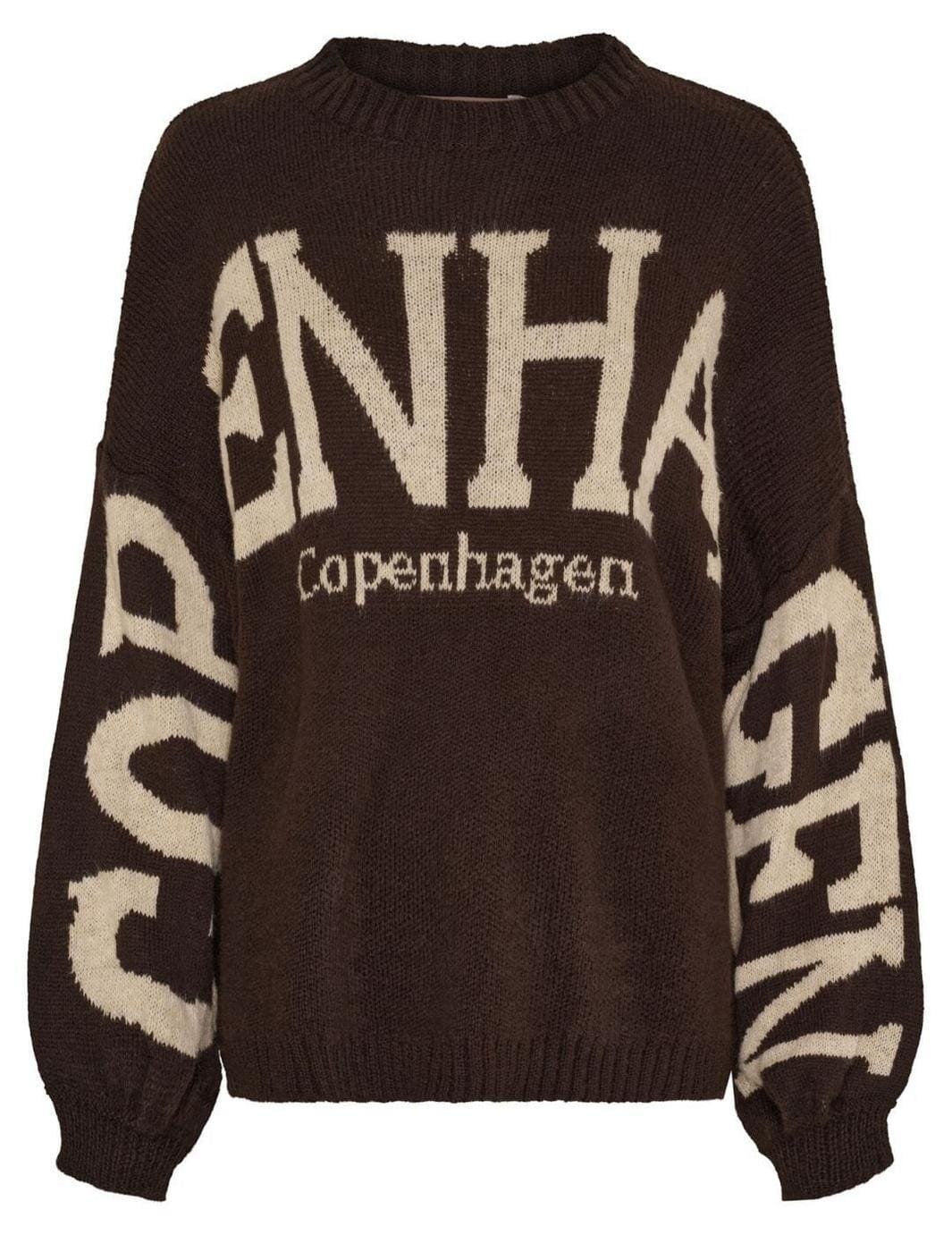 Mørkebrun strikk fra Marta Du Chateau med et printet tekstdesign i beige. Strikken har en oversized passform og en rund halsutskjæring.