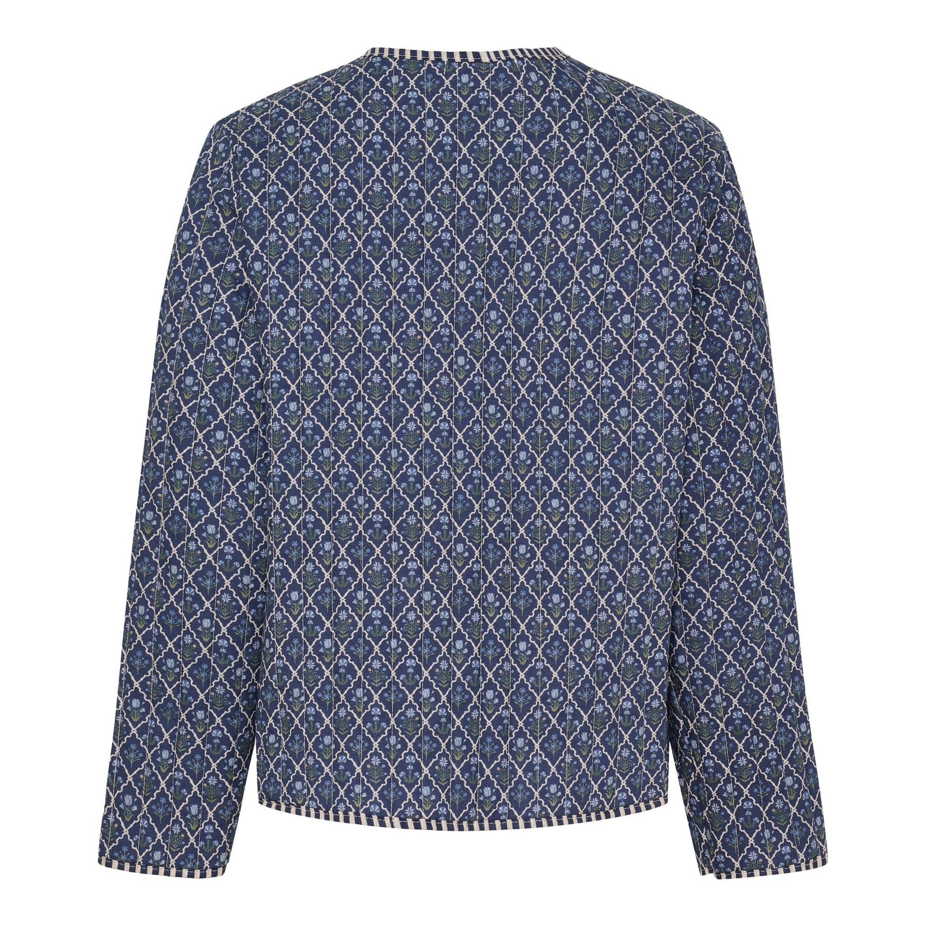 Mørkeblå jakke fra Marta Du Chateau med rutemønster og dekorative sømmer. Den har rund halsutskjæring, knappelukking foran og to praktiske frontlommer med kontrastmønster.