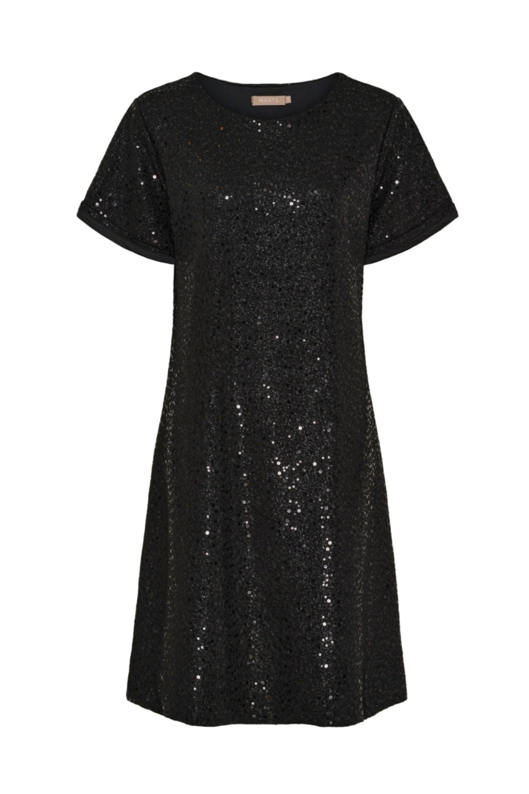 Svart kjole fra Marta Du Chateau med paljetter over hele kjolen. Den korte modellen har rund hals og korte ermer, noe som gjør den enkel å style til fest.