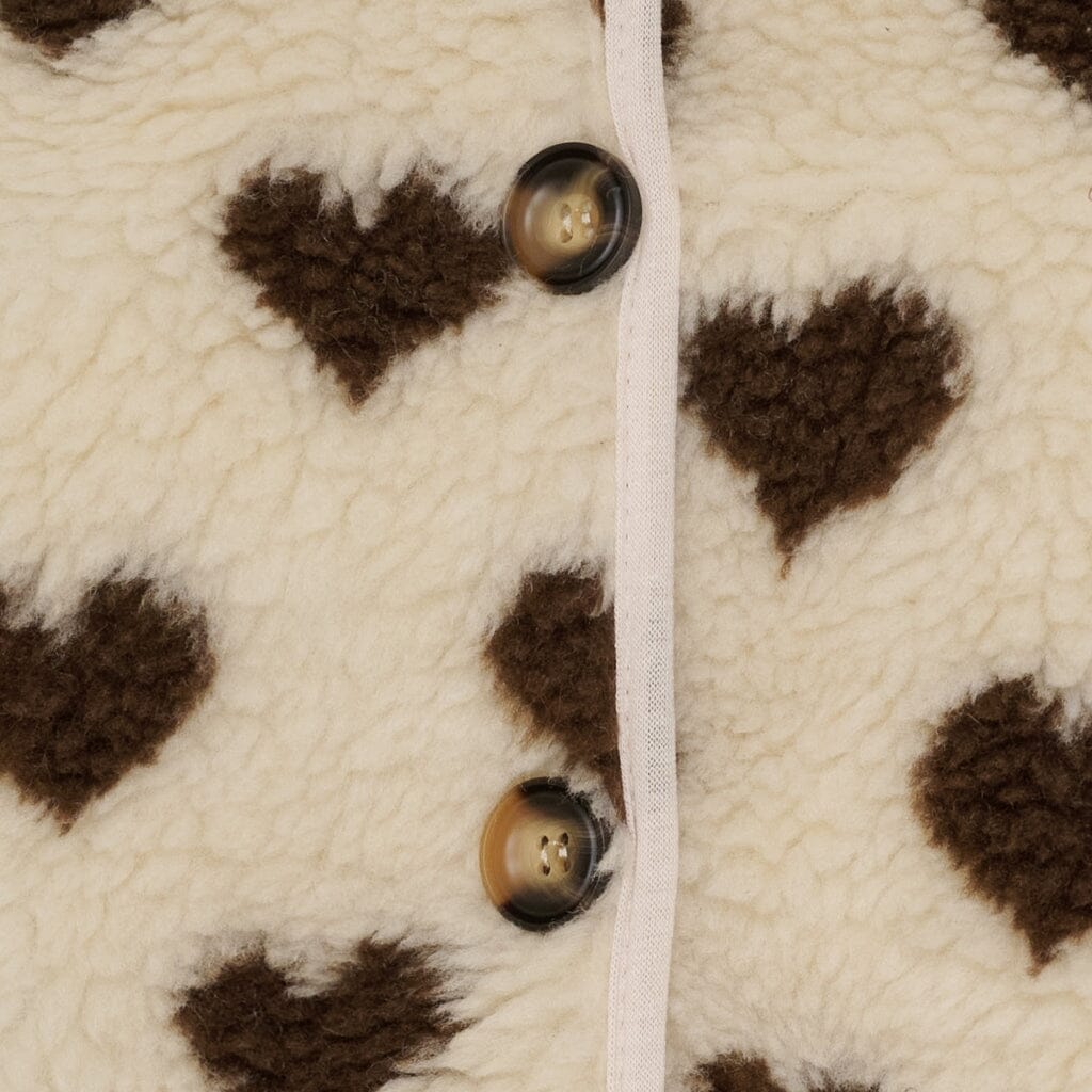 Vest fra Marta Du Chateau i krem med mørkebrune hjerteformede mønstre. Vesten har mørke kanter langs sidene og en knappelukking foran.
