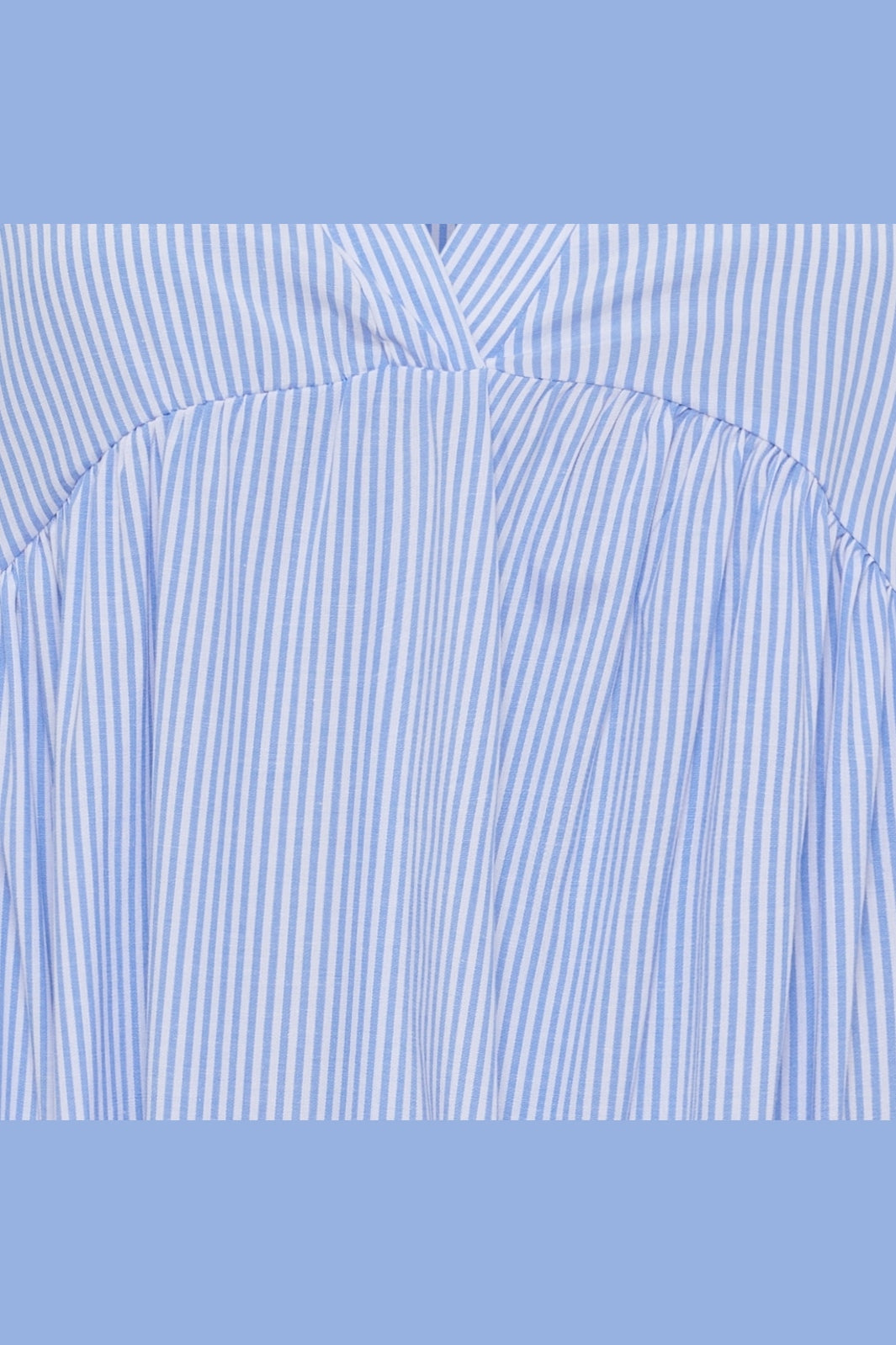 Stripet kjole fra Marta Du Chateau i lyseblått og hvitt. Kjolen har et tiered design med volanger på ermene og V-utringning.