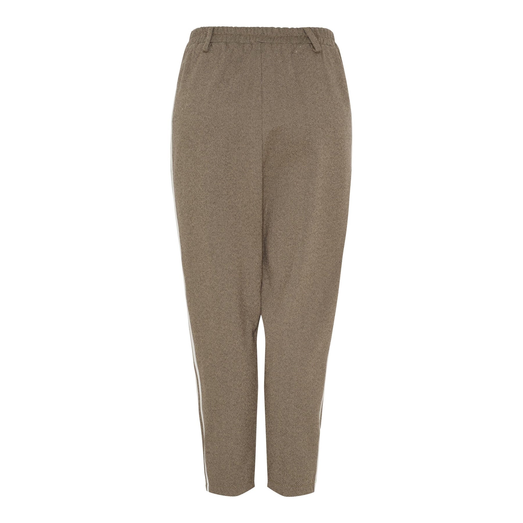 Brune bukser fra Marta Du Chateau med hvite striper langs benene. Buksene har en løs passform og går til midt på leggen. De har både glidelås, elastikk og knapper i midjen.