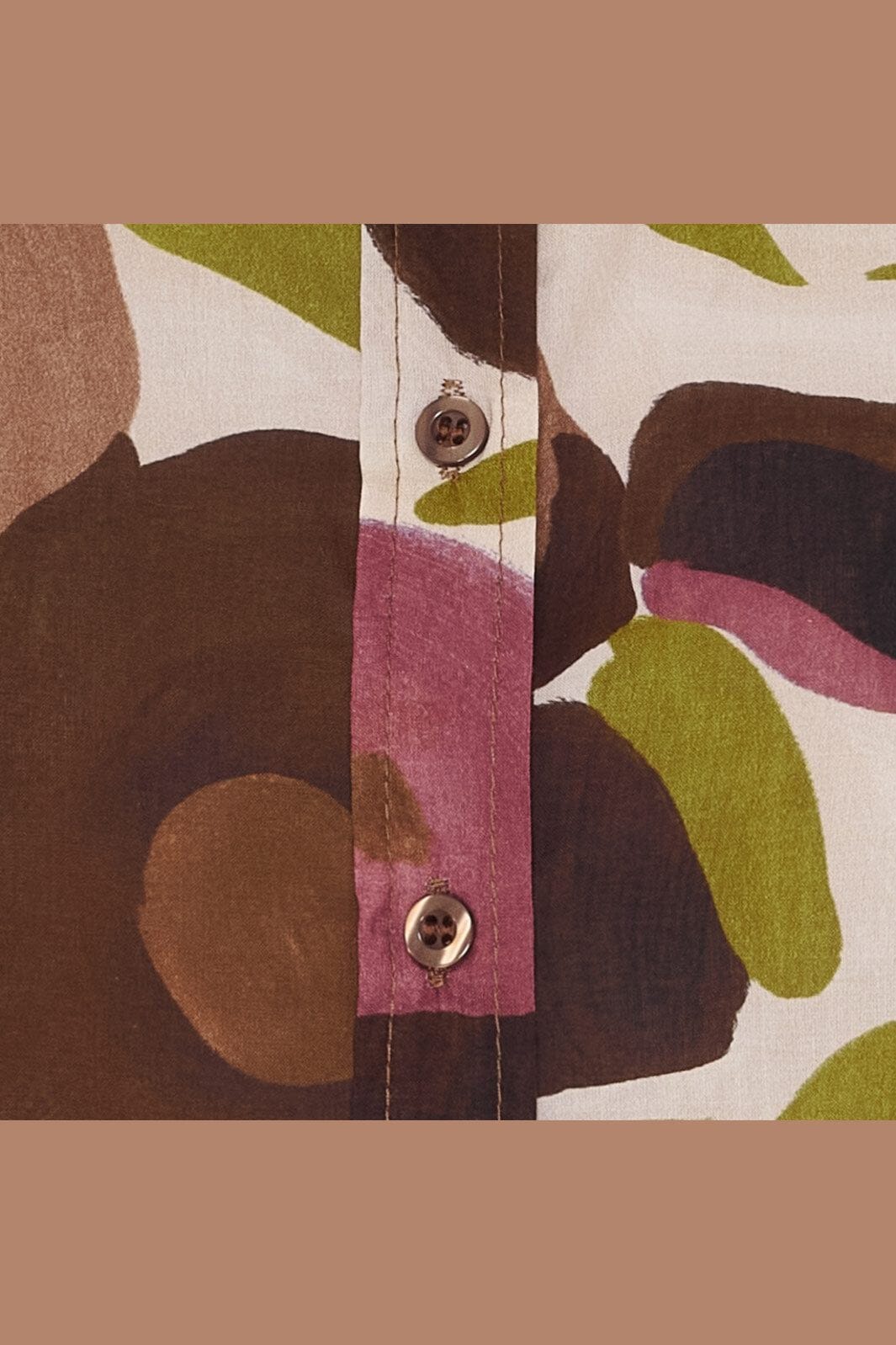 Skjorte fra Marta Du Chateau med blomsterprint i brune, rosa og grønne nyanser på hvit bunn. Skjorten har rund hals og 3/4 ermer med puff.