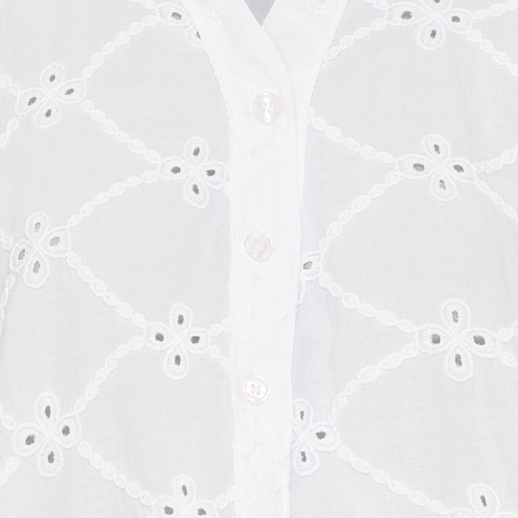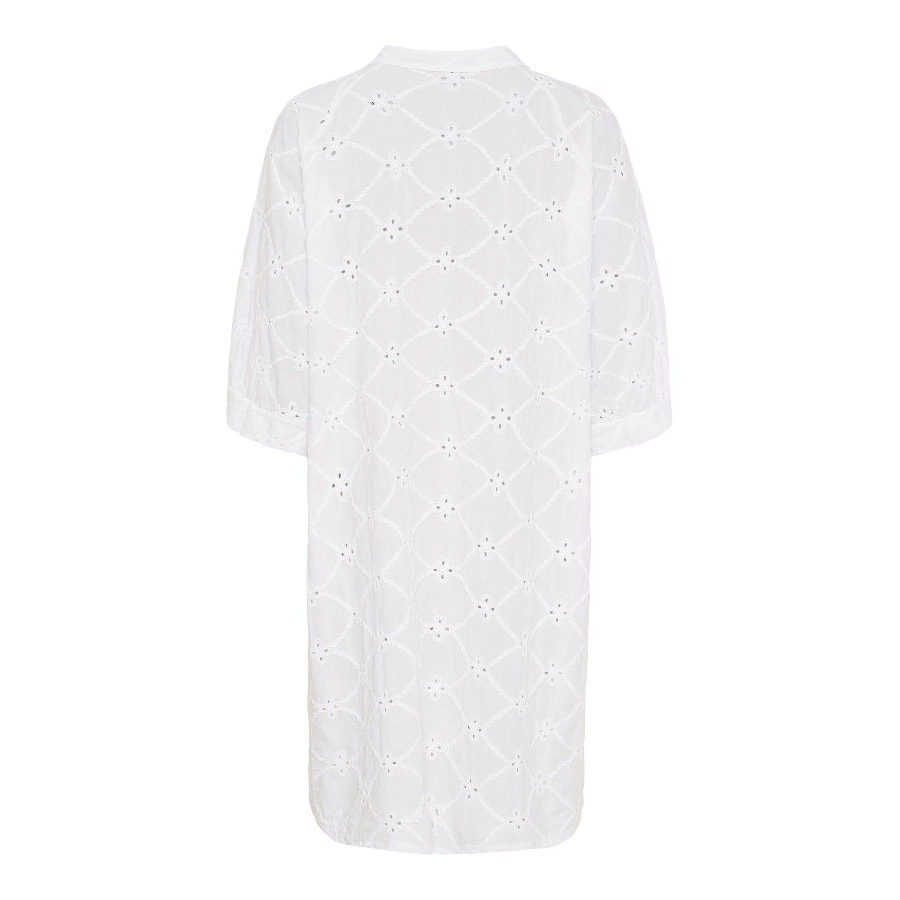Hvit kjole fra Marta Du Chateau med brodert blomstermønster. Kjolen har skjortekrage, 3/4-ermer og knelength. Den løse passformen gir god bevegelsesfrihet.