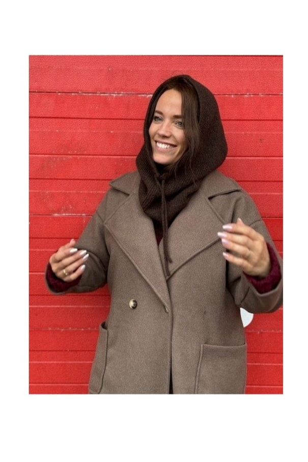Brun balaklava fra Marta Du Chateau med ribbestrikket tekstur. Den har en justerbar snor foran og beskytter godt mot kulden med sin praktiske passform.