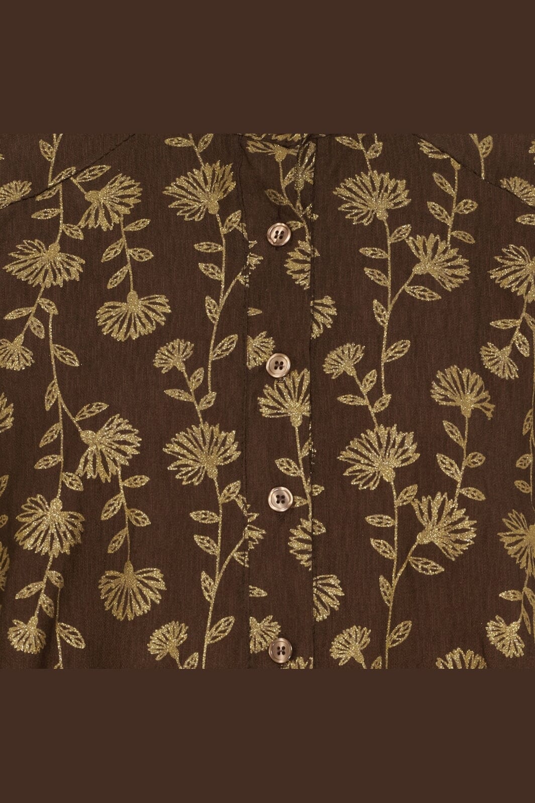 Brun kjole fra Marta Du Chateau med gyldent blomsterprint. Kjolen har knapper hele veien ned, skjortekrage og lange ermer med elastikk ved håndleddene.