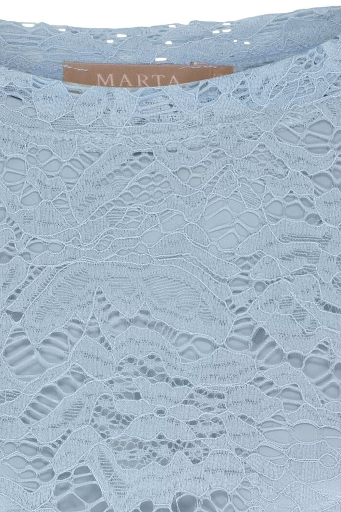 Lys blå blondebluse fra Marta du Château. Blusen er en pullover uten lukking og har et detaljert blondemønster over hele overflaten.
