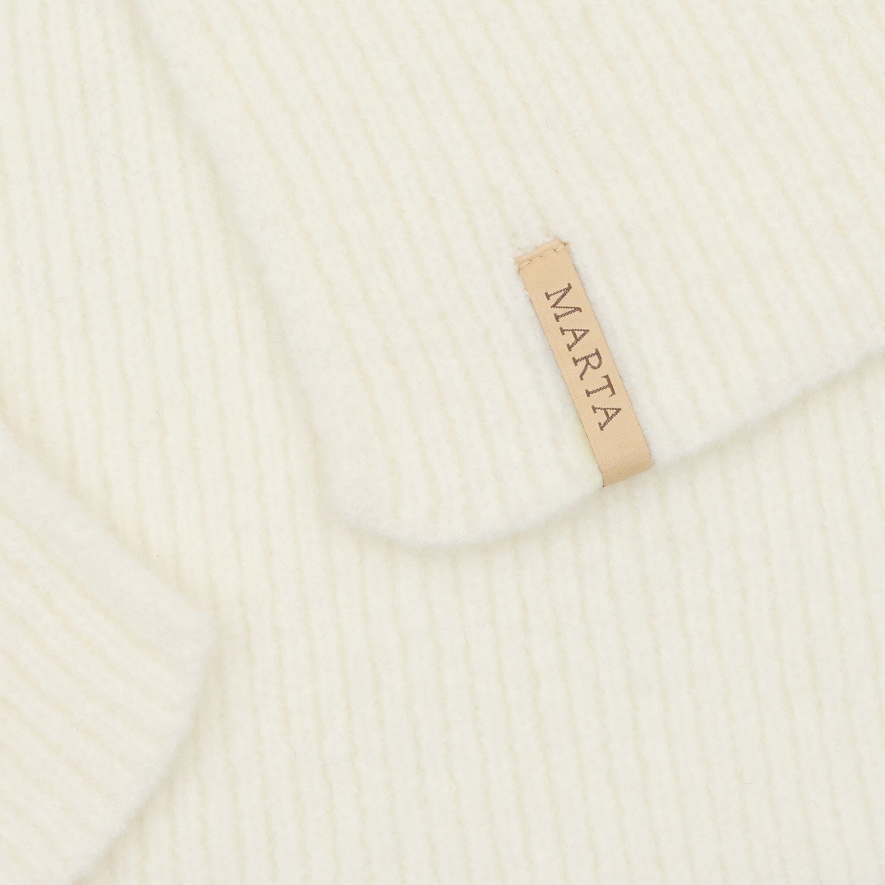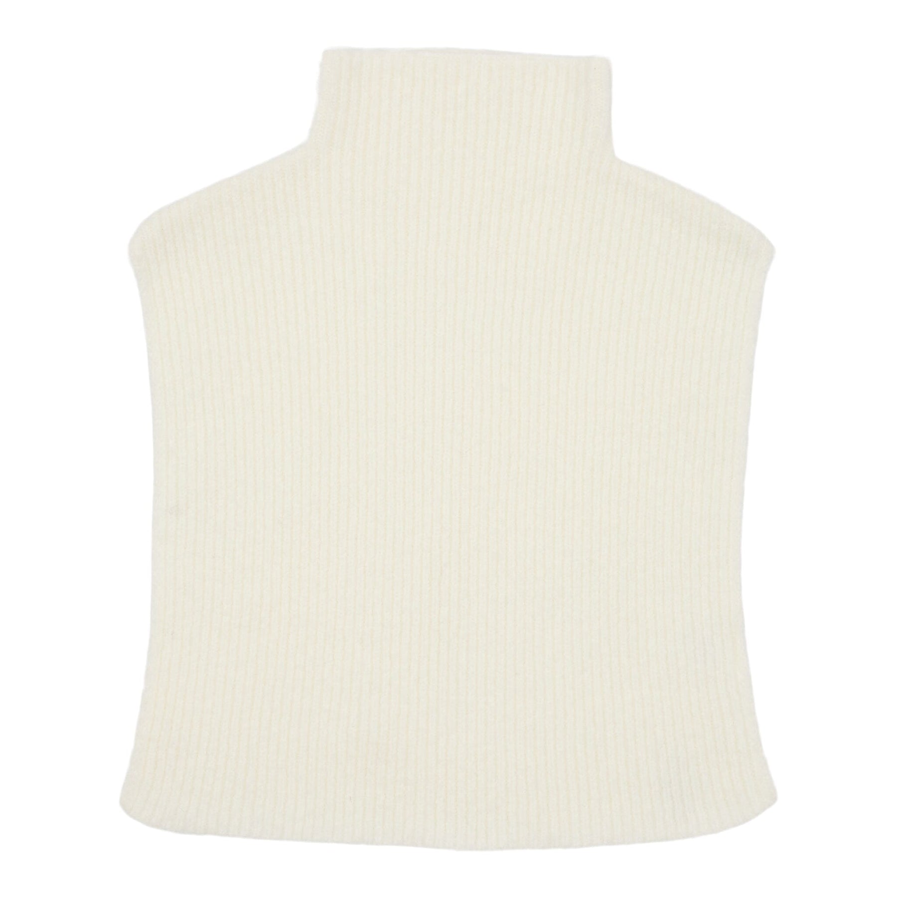 Hvit skjerf fra Marta Du Chateau med høy krage og ribbestrikket design. Skjerfet har en nøytral offwhite farge og en god struktur som gir varme rundt halsen.